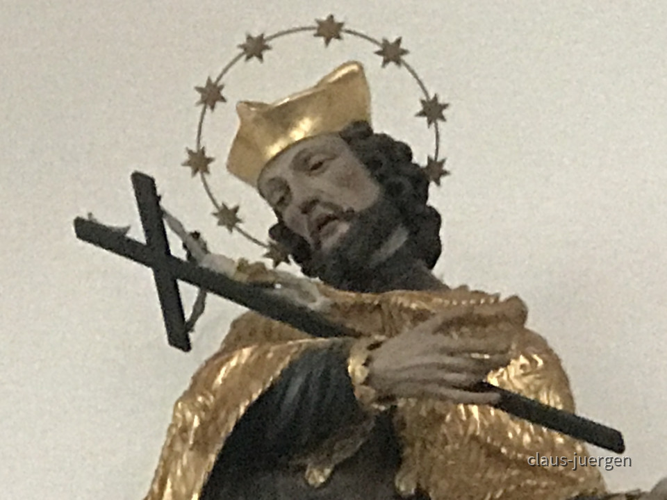 Dieser Heilige schaut verdächtig nach Nepomuk aus. Andererseits fehlen ihm wichtige Kennzeichen wie das Kreuz und die Feder.