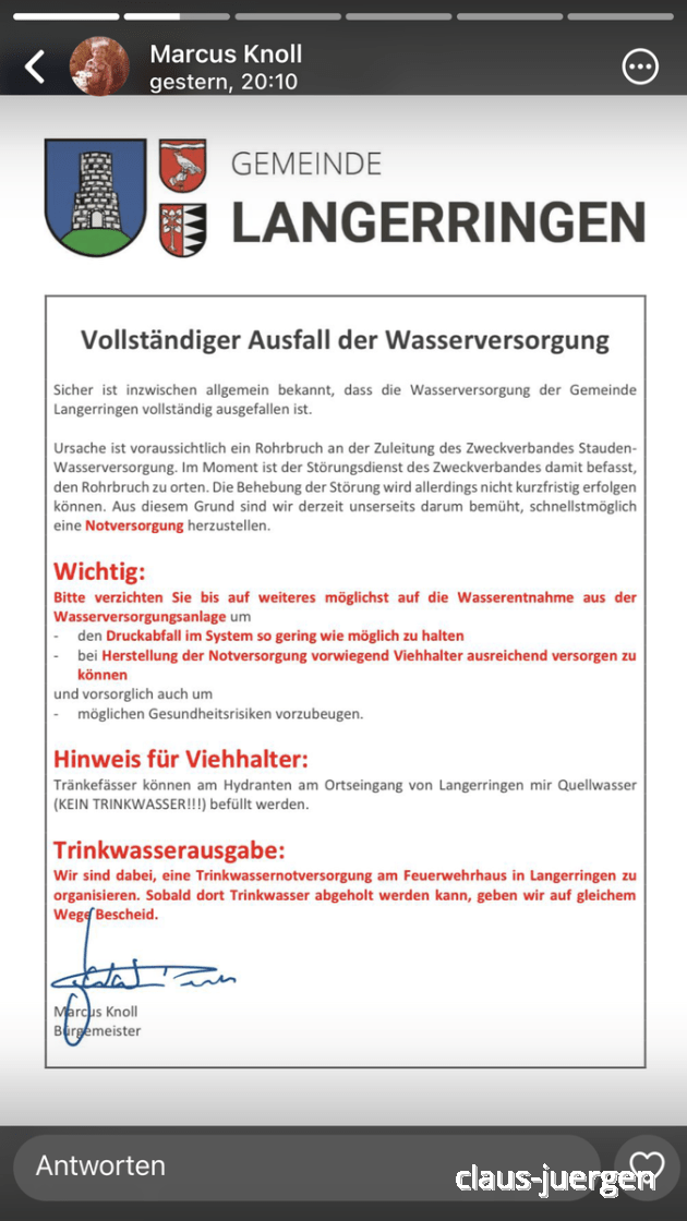 Wie wichtig es ist, daß aus dem Wasserhahn regelmäßig unbegrenzt Trinkwasser fließt merkt man erst wenn es hakt. Gestern am späten nachmittag floß nur noch ein Rinnsal aus dem Hahn. Mir war schnell klar, daß das nicht an unserer Hausinstallation lag weil ich mit dem Schwiegersohn ein paar Häuser weiter telefonierte. Dort das gleiche Problem. Nachdem auch ich zu den Menschen gehöre die ein paar mal am Tag ins Handy schauen fand ich schnell die Lösung in Form einer Whattsapp Status Meldung unseres Bürgermeisters.