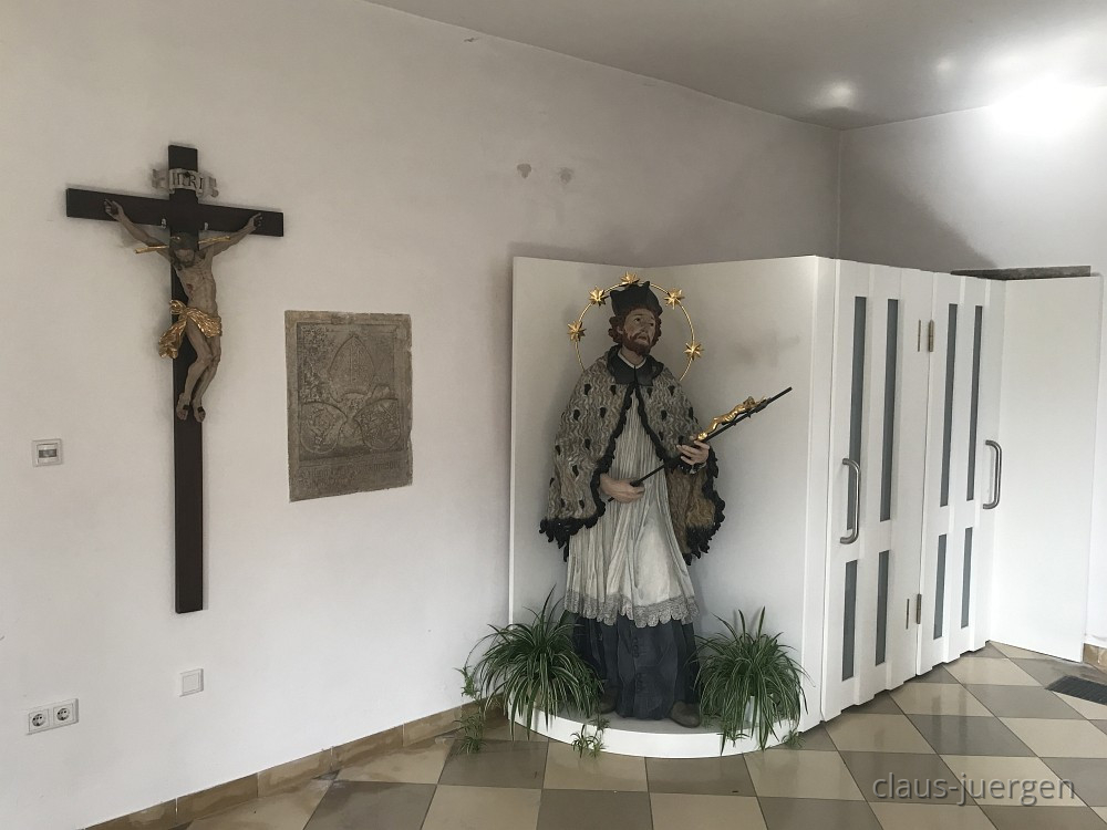 In der Kirche der Gemeinde steht ein Nepomuk direkt neben dem Beichtstuhl.