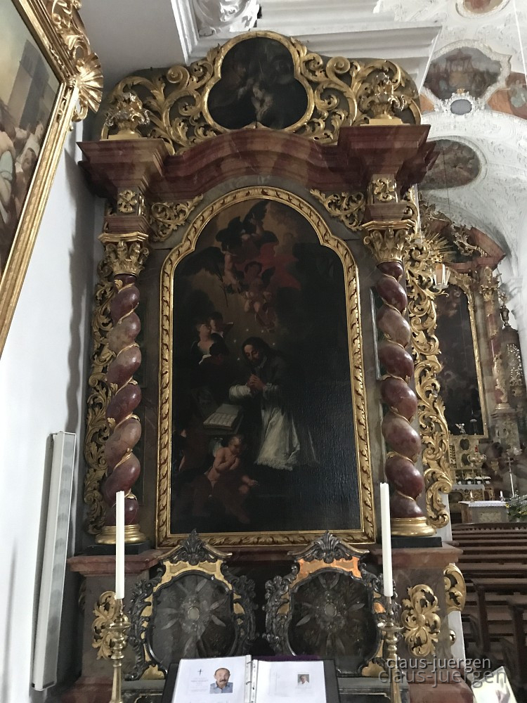 Auf dem kleineren der beiden linken Seitenaltäre ist Nepomuk zu entdecken.