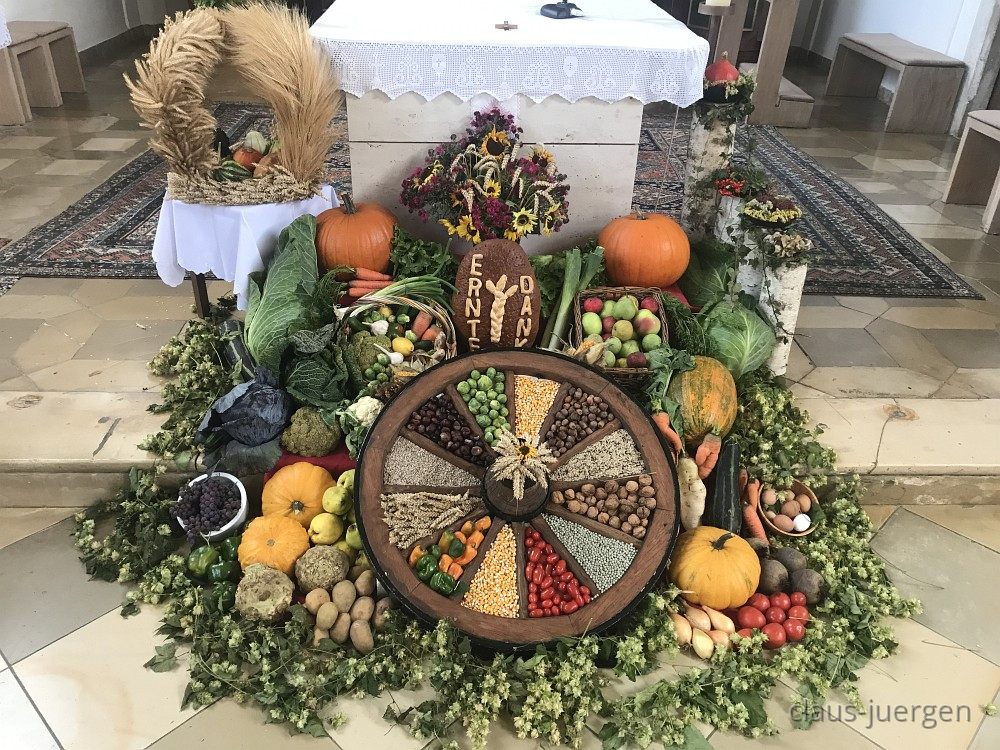 Jetzt im Oktober gibt es in vielen Kirchen in meiner Heimat sogenannt Erntedank Körbe. Der hier befindet sich direkt vor dem Altar.