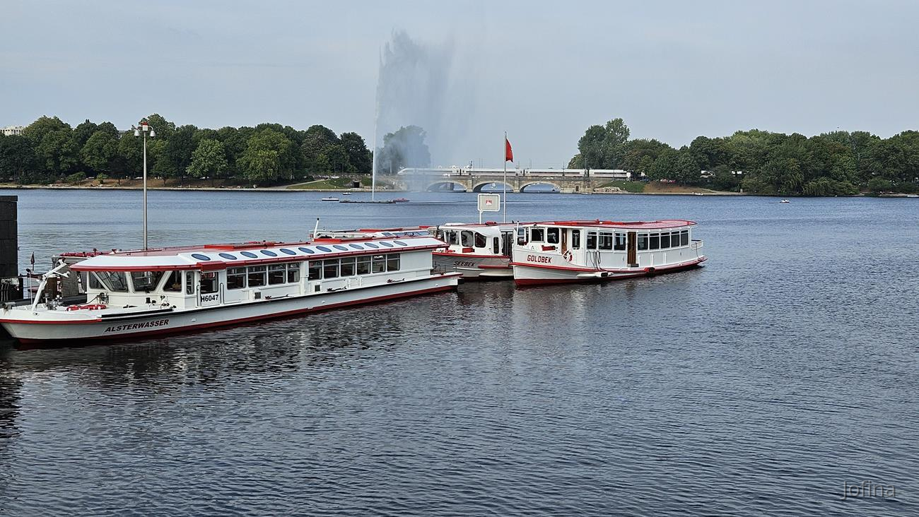 Die Kreuzfahrt endete wieder in Hamburg. Wir kamen schon morgens an, unser Weiterflug nach Madrid war jedoch erst am Abend. Natürlich konnten wir nicht so lange auf dem Schiff bleiben. Um 9.00 h mußte die Kabine verlassen werden. Ein Shuttle-Bus hat uns dann zum Hamburger Flughafen gebracht. Wir haben dort unsere Koffer in die Gepäckaufbewahrung abgegeben. So hatten wir noch Zeit für einen individuellen Ausflug zur Hamburger Binnenalster. Mit der S-Bahn sind wir dort hingefahren. Das Wetter war angenehm, so daß wir einen Spaziergang um die Binnenalster unternommen haben, incl. lecker Eis-Essen.