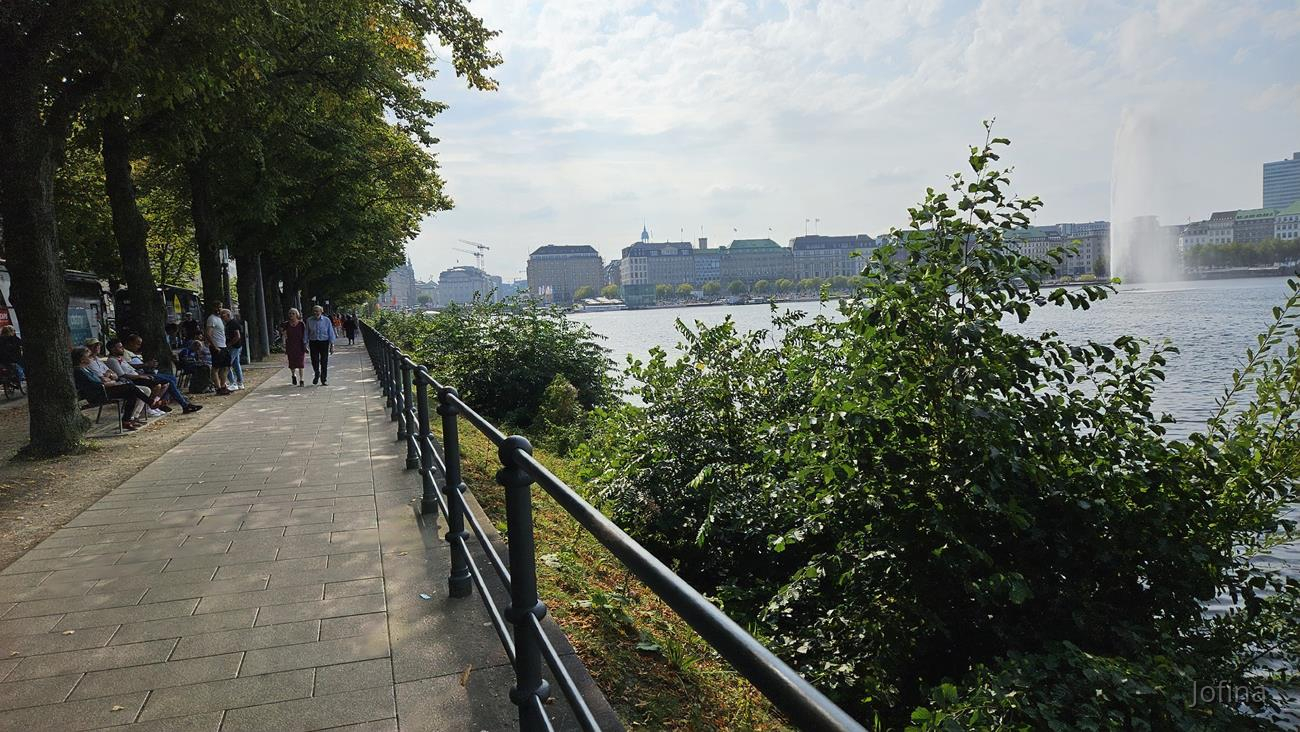 Die Kreuzfahrt endete wieder in Hamburg. Wir kamen schon morgens an, unser Weiterflug nach Madrid war jedoch erst am Abend. Natürlich konnten wir nicht so lange auf dem Schiff bleiben. Um 9.00 h mußte die Kabine verlassen werden. Ein Shuttle-Bus hat uns dann zum Hamburger Flughafen gebracht. Wir haben dort unsere Koffer in die Gepäckaufbewahrung abgegeben. So hatten wir noch Zeit für einen individuellen Ausflug zur Hamburger Binnenalster. Mit der S-Bahn sind wir dort hingefahren. Das Wetter war angenehm, so daß wir einen Spaziergang um die Binnenalster unternommen haben, incl. lecker Eis-Essen.