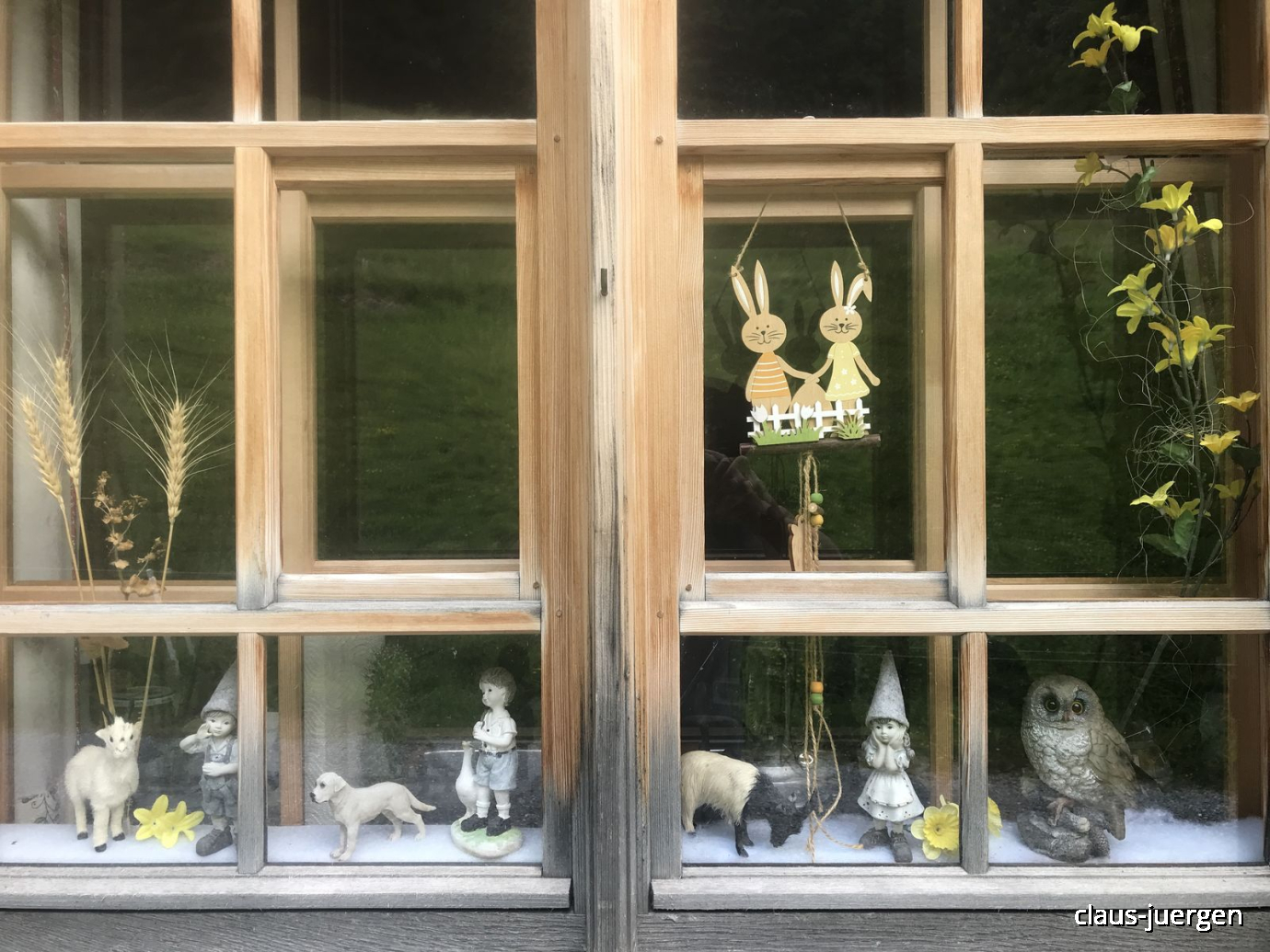 An einer inzwischen anscheinend als Wochenendhaus genutzten ehemaligen Landwirtschaft fällt uns die originelle Fensterdekoration auf.