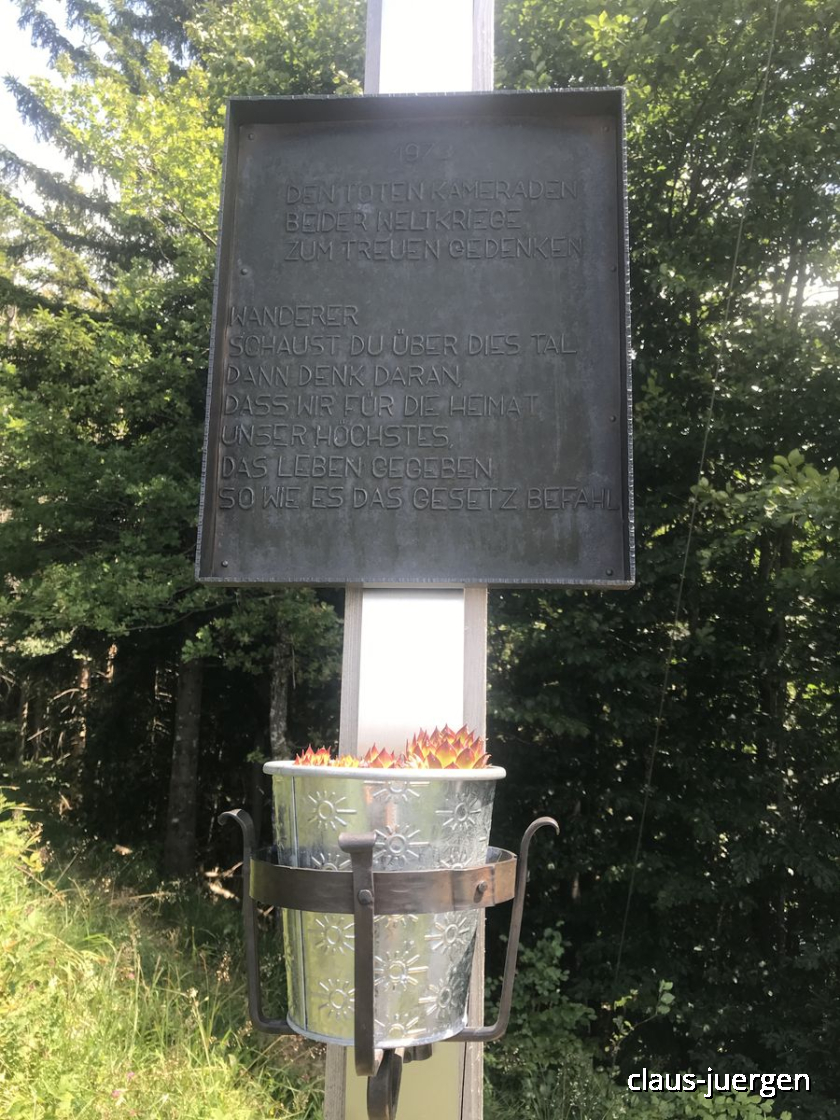 Schließlich ist es so weit. Wir sind oben. Man hat hier extra den Wald etwas gelichtet um das Gipfelkreuz und eine Bank aufstellen zu können, so daß Wanderer in die Ferne blicken.