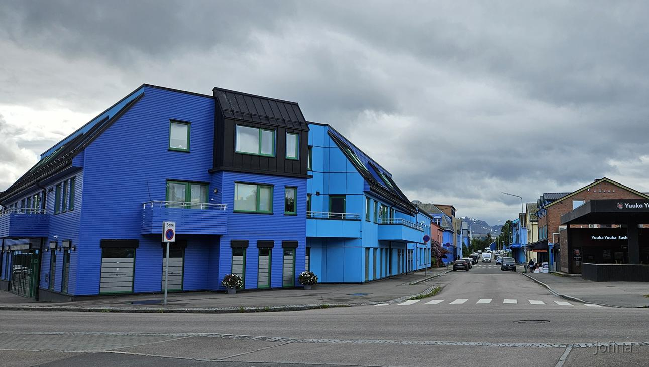 Es war allerdings sehr kühl und windig. Deshalb waren wir froh, daß wir Kapuzen-Jacken angezogen hatten. Hier haben wir auch wieder zu Fuß in Eigenregie eine Besichtigung unternommen. Man sieht in diesem Hafenort übrigens viele blau angemalte Häuser. Sortland trägt deshalb auch den Beinamen: „die blaue Stadt“ .