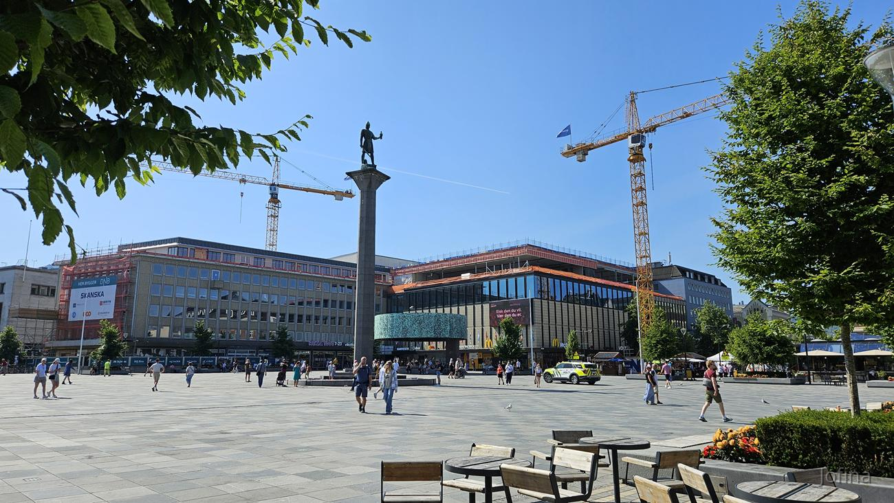 Im Sommer 2018 war der große Marktplatz eine riesige Baustelle gewesen. Nun war fast alles fertig, lediglich 2 Kräne waren noch zu sehen. Das Denkmal des Wikingerkönig Olav (er gründete Trondheim im Jahr 997) steht weiterhin in der Mitte des Platzes.