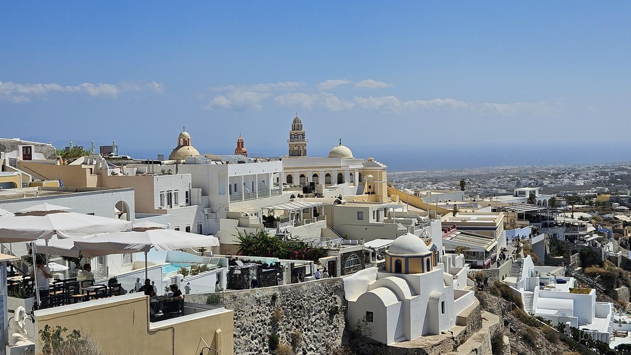 Nun noch den Aussichtspunkt oberhalb der Kirche finden… Diesmal gelang es einigermaßen schnell. :) Jetzt standen wir vor den 3 Glocken von Fira, eine Kirche mit blauer Kuppel.