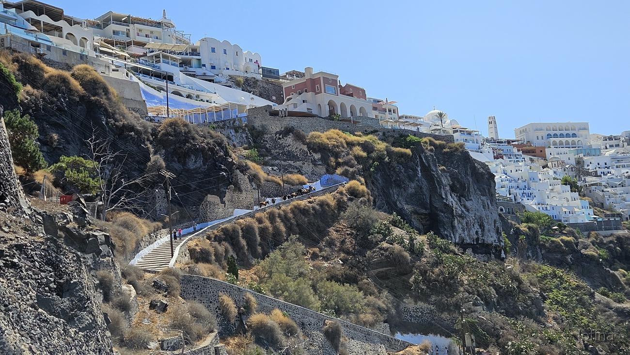 Wir hatten Glück, denn das Tenderboot nach Fira auf Santorin war kaum gefüllt (fuhr aber trotzdem los) und auch an der Seilbahnstation hatte sich keine Schlange gebildet. Die meisten Kreuzfahrer waren also schon unterwegs.