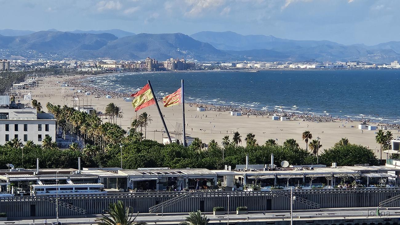 Fotos vom Schiff, Kabine, Strand von Valencia und Abendstimmung zur Hafenausfahrt: