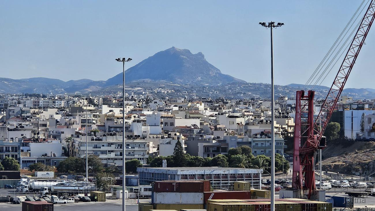 Ein vertrauter Blick von unserem Schiffsbalkon auf Heraklion mit diesen Berg im Hintergrund.