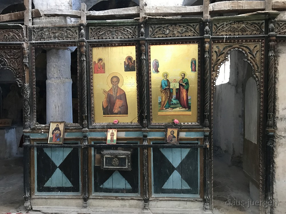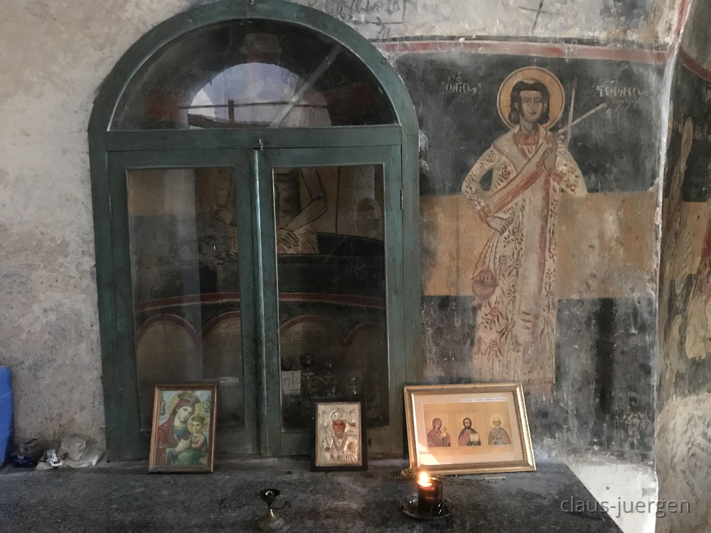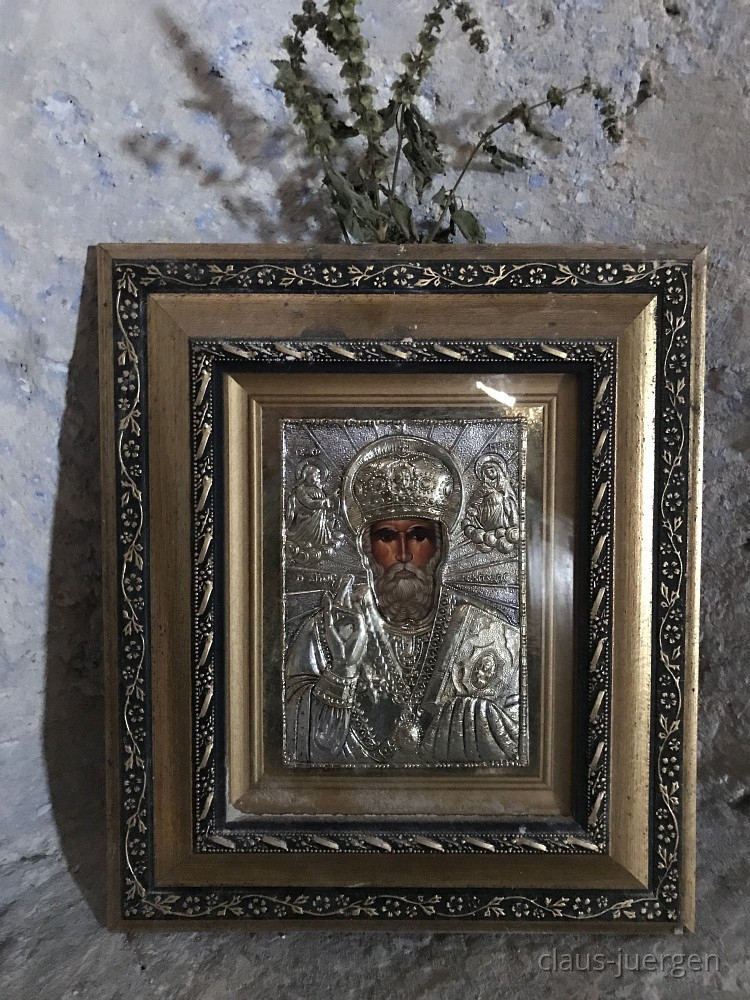 Auch Ikonen sind vorhanden. In einer Ecke brennt sogar eine Kerze.