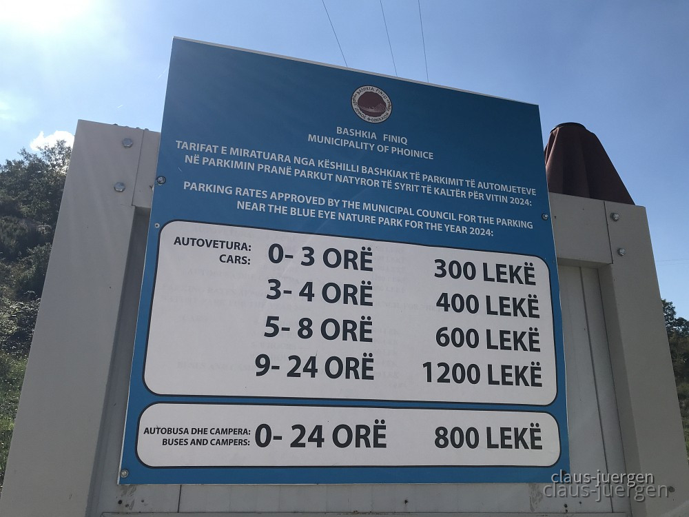 Nun kostet hier zwar das Parken bis drei Stunden 300 Lek, also 3 Euro. Aber auch das ist Albanien. Es gibt keine Parkuhr oder Schranke. Man bezahlt bei der Einfahrt in den Parkplatz bei einem Bediensteten und niemand überprüft wie lange der Pkw dort steht. Wir sind übrigens zwei Stunden hier gewesen weil wir den teils abenteuerlichen Rundweg ums Wasser genommen haben.
