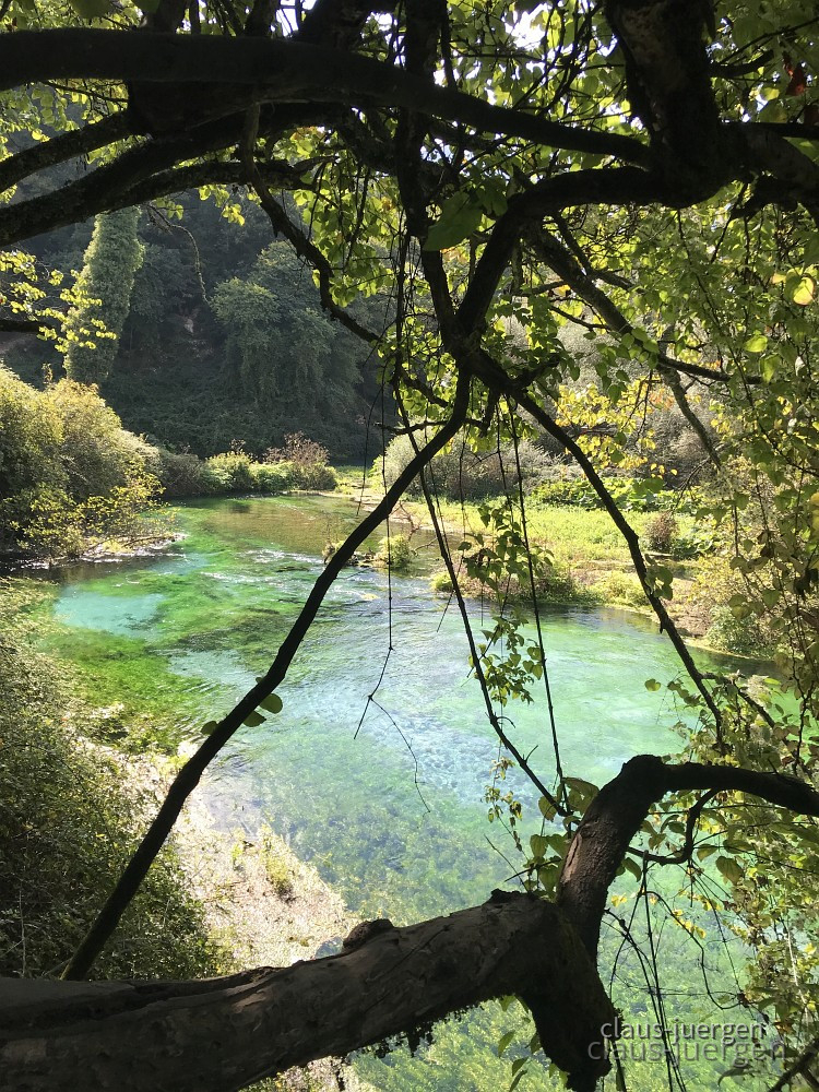 Wer genau hinsieht erkennt hinter dem breiten Algenteppich ein Kanu. Solche kann man mieten und bis fast zur Quelle paddeln. Eine durchaus reizvolle Möglichkeit diese Naturlandschaft kennenzulernen.
