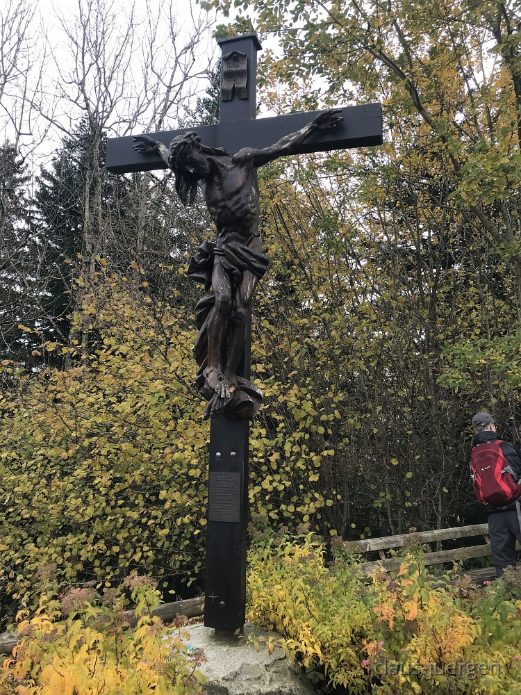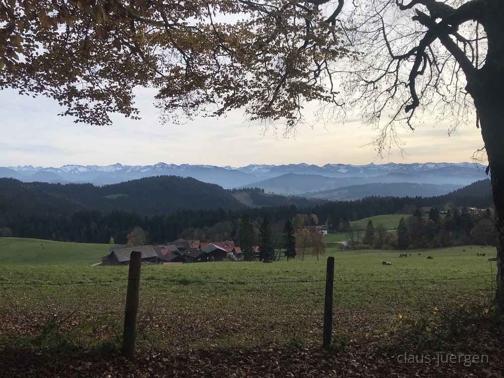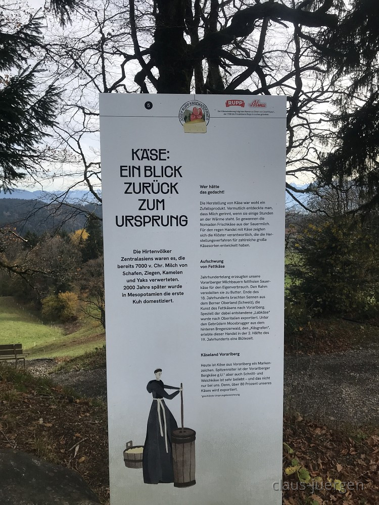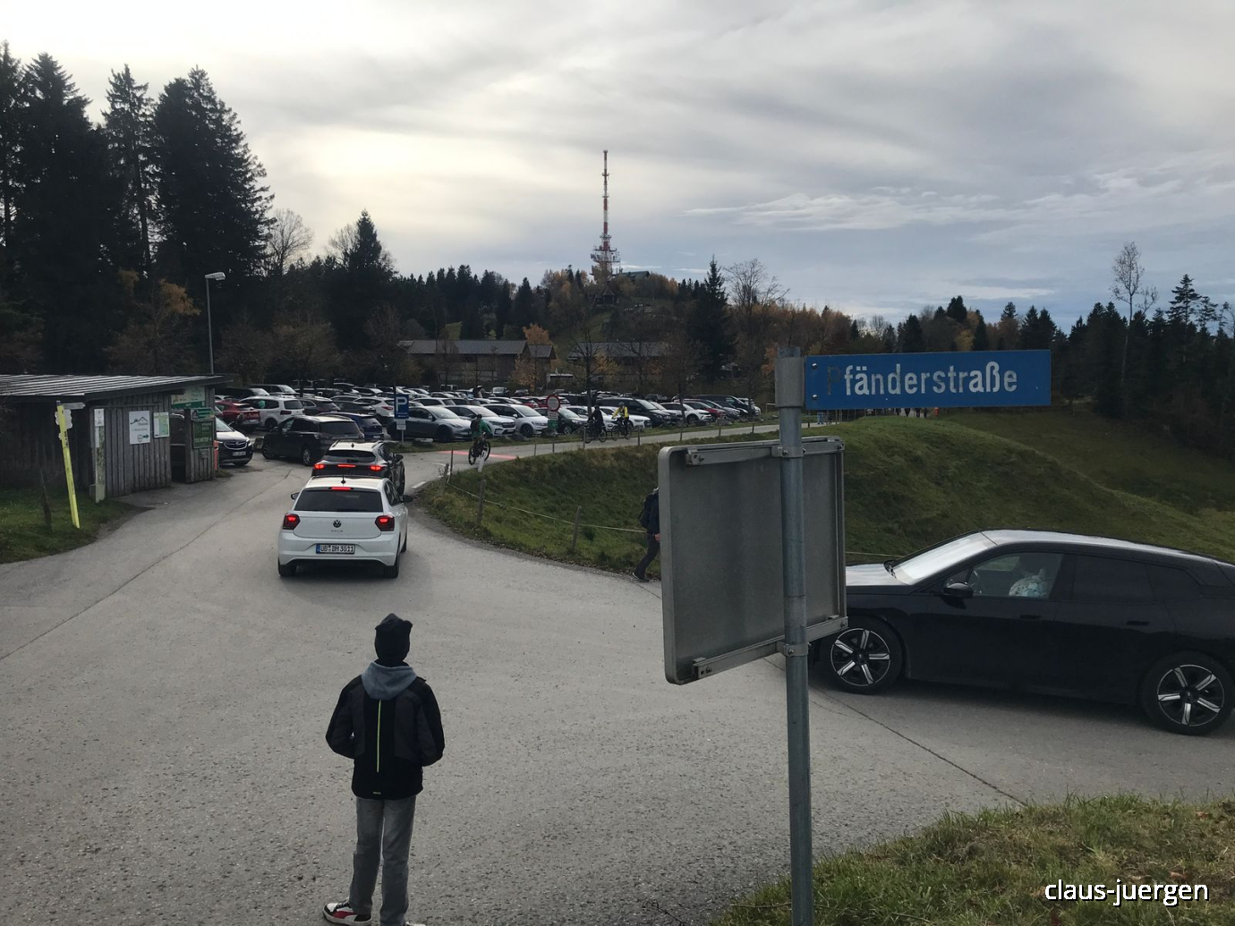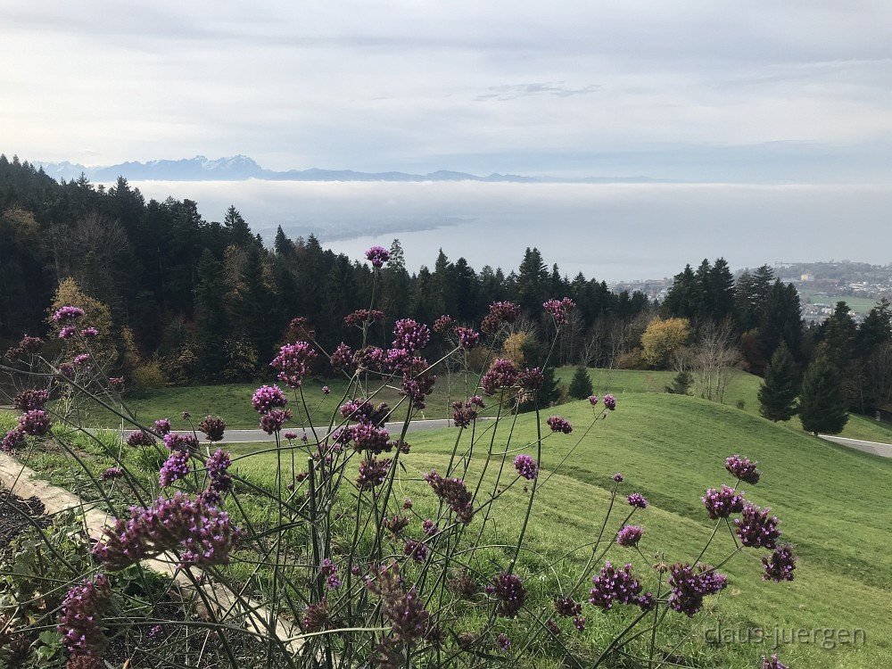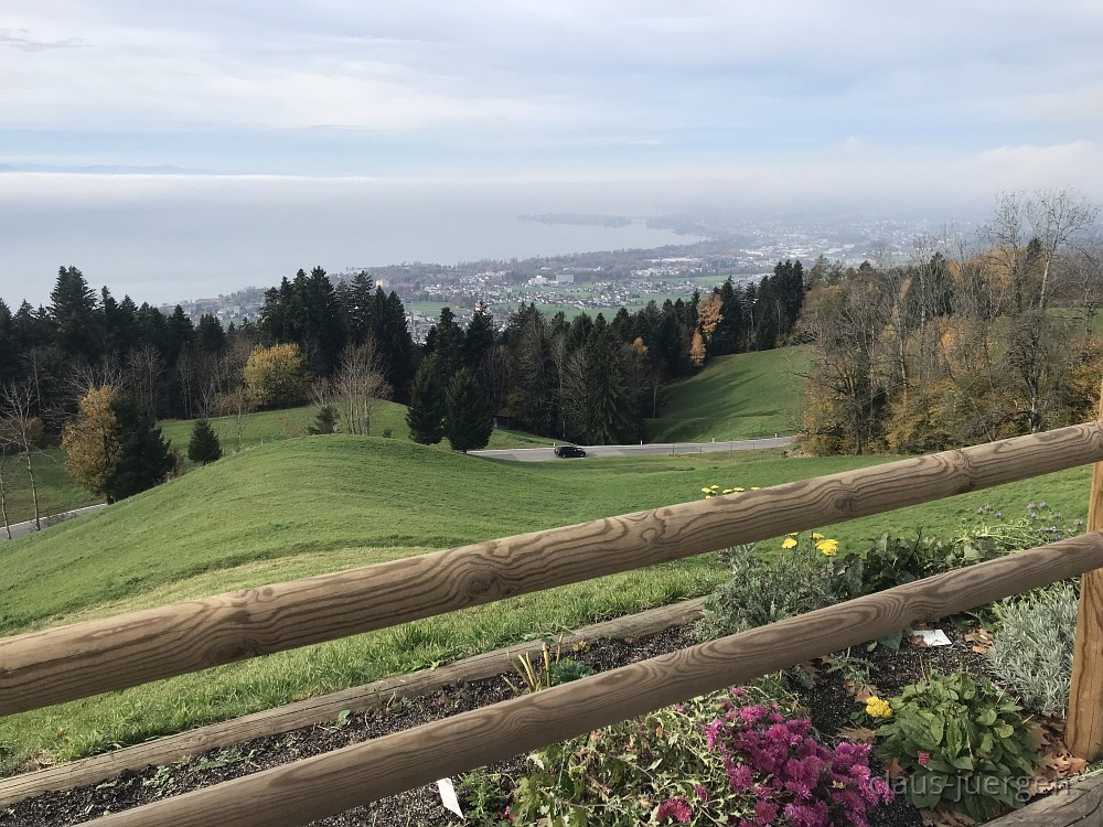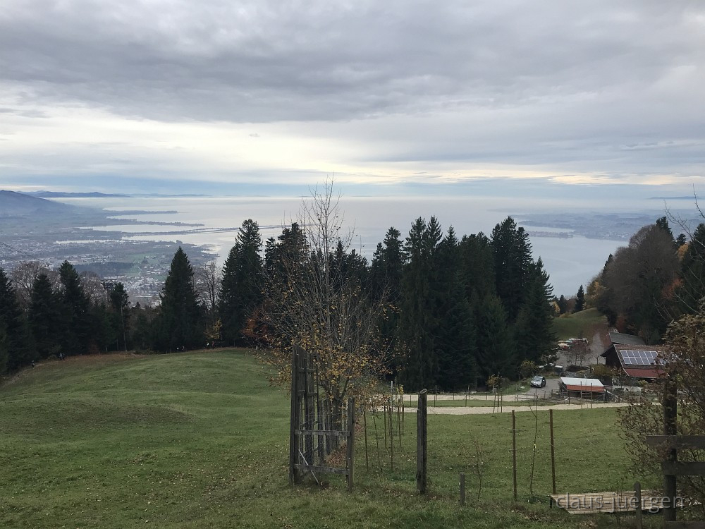 Allerheiligen ist so ein Tag an dem man nicht nur den Verstorbenen gedenkt, sondern an dem es oft mit dem naßkalten und nebligen Novemberwetter beginnt. Ganz so war es vor drei Tagen nicht. Die Webcam zeigte mir an, daß zwar der Bodensee weitgehend im Nebel lag, oben auf dem Pfänder hingegen die Sonne scheint. Also nichts wie los mit dem Enkel Alex auf der Rückbank um in gut eineinviertel Stunden über die A96 nach Eichenberg bei Bregenz zu fahren. Von dort aus wollten wir 290 Höhenmeter überwinden und zum Pfänder, bekannt durch seinen Autobahntunnel und eine große Antenne, wandern.