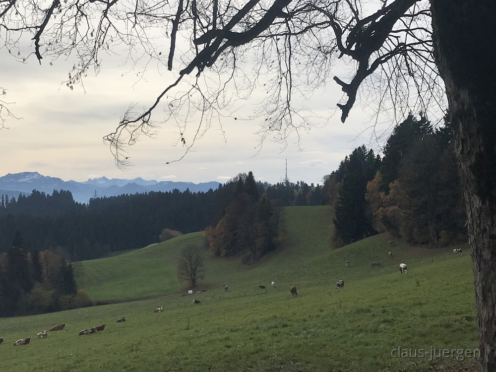 Wir nahmen den Höhenweg welcher zu dem Zeitpunkt durch feuchten Lehm und Laub etwas unangenehm zu begehen war. Nach einer Dreiviertelstunde kamen wir aus dem Wald und hatten einen guten Blick auf die Vorarlberger Gipfel.