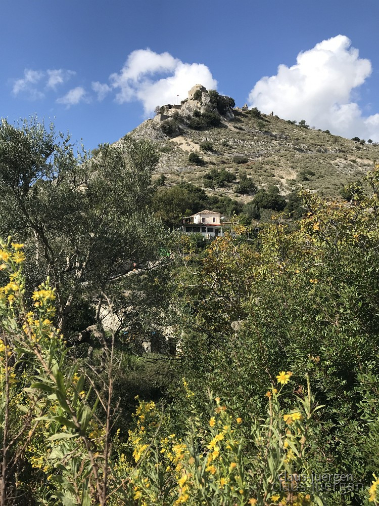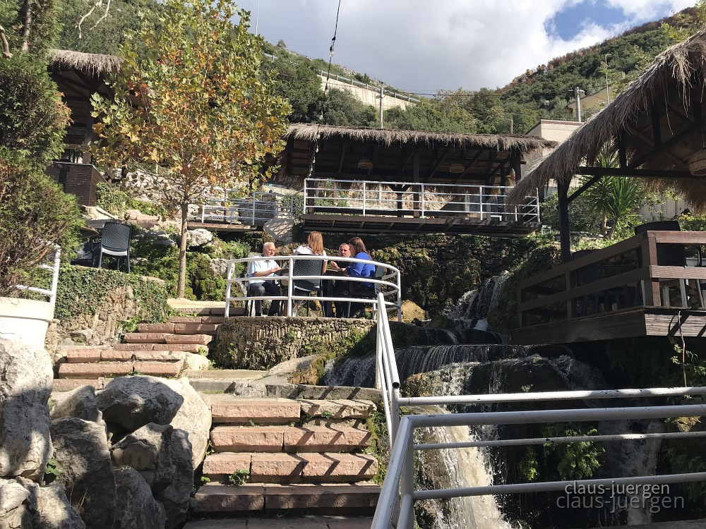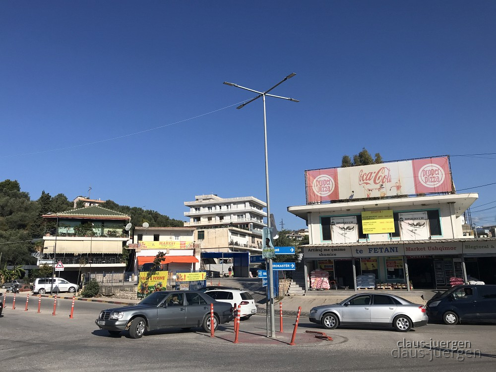 Im Haus ganz links sieht man im Obergeschoß eine Terrasse mit einer weißen Markise. Das ist ein Cafe und dort sollte es am Ortsrand von Saranda erst einmal ein Frühstück geben.