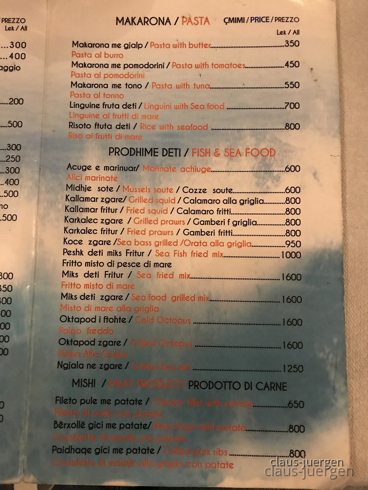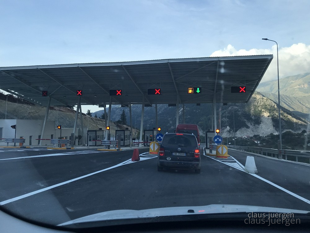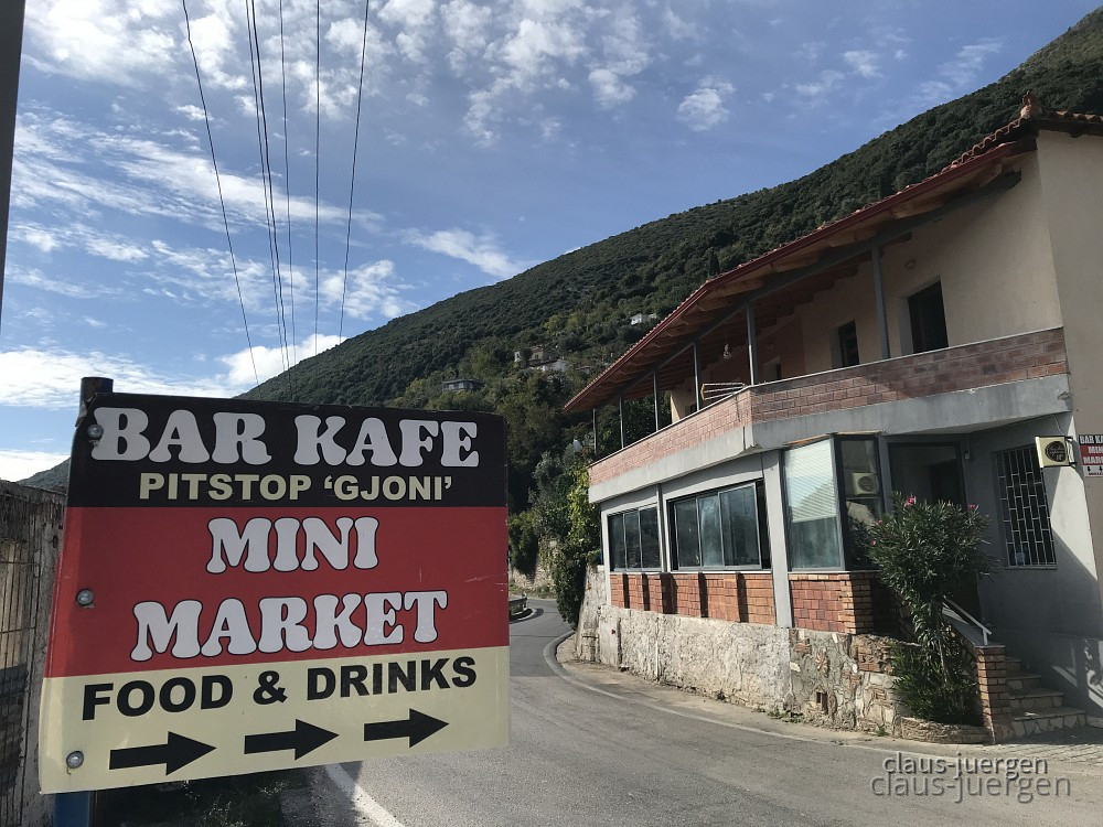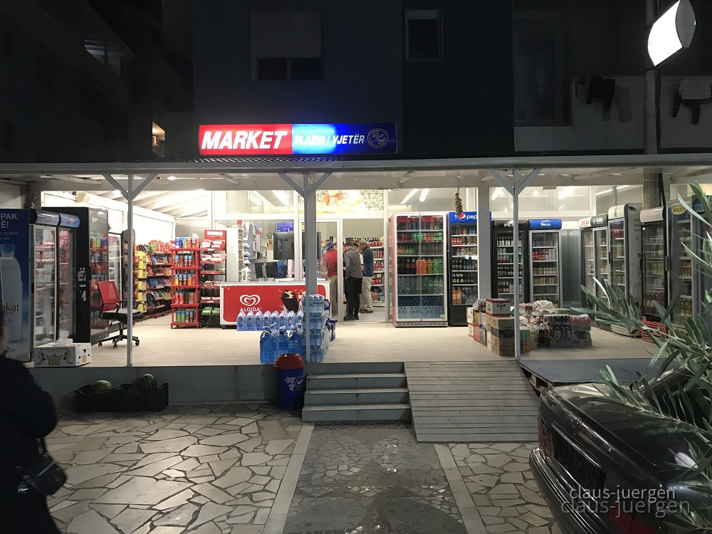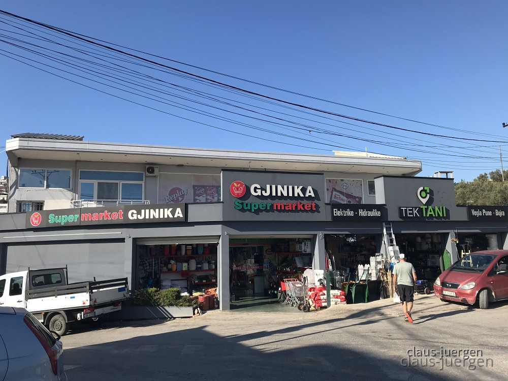 Gegenüber befindet sich der Supermarkt und auch dort gab es nichts außer drei verschiedene Sorten Brot in Folie verpackt. Also haben wir ein paar Meter weiter bei einem Bäcker etwas mitgenommen was als Frühstück dienen sollte. Obwohl wir beide nicht heikel sind, war das ofenwarme Gebäck mit Schinken und zerlaufenem Käse nicht das was wir uns vorstellten. Beide haben wir es probiert. Anscheinend haben die Albaner diesbezüglich einen seltsamen Geschmack. Hätte es wenigstens ein Croissant wie in manchen Bäckereien gegeben wäre das ja zumindest noch ein Imbiß zum Cappuccino gewesen. Aber das Zeug?