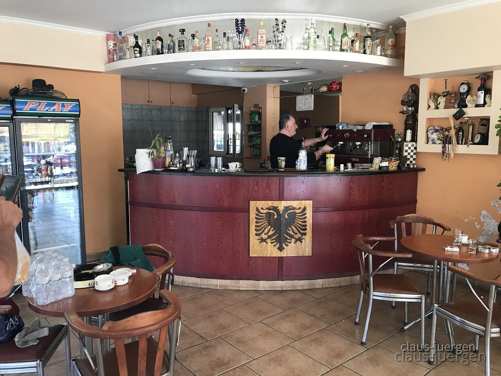 Es gab ein Glas Wasser dazu und der Milchschaum ist auch zumindest rudimentär vorhanden. Also bestellten wir noch eine zweite Tasse was den Wirt noch mehr erfreute. Ansonsten ergab sich kein Gespräch weil wir nicht albanisch und der Wirt nicht deutsch oder englisch sprach. Aber manchmal versteht man sich auch mit Gesten oder einzelnen Worten.