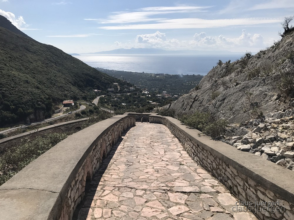 Wir sehen von hier aus das Druckrohr eines Wasserkraftwerks direkt am Meer. Albanien erzeugt seinen Strom wenn auch aufgrund der im Sommer mangelnden Niederschläge über einen Großteil des Jahres durch Wasserkraft.