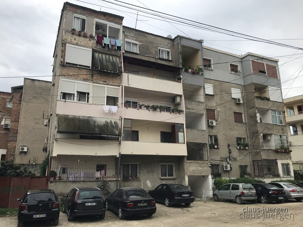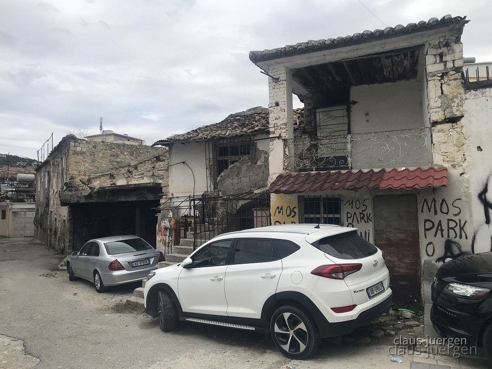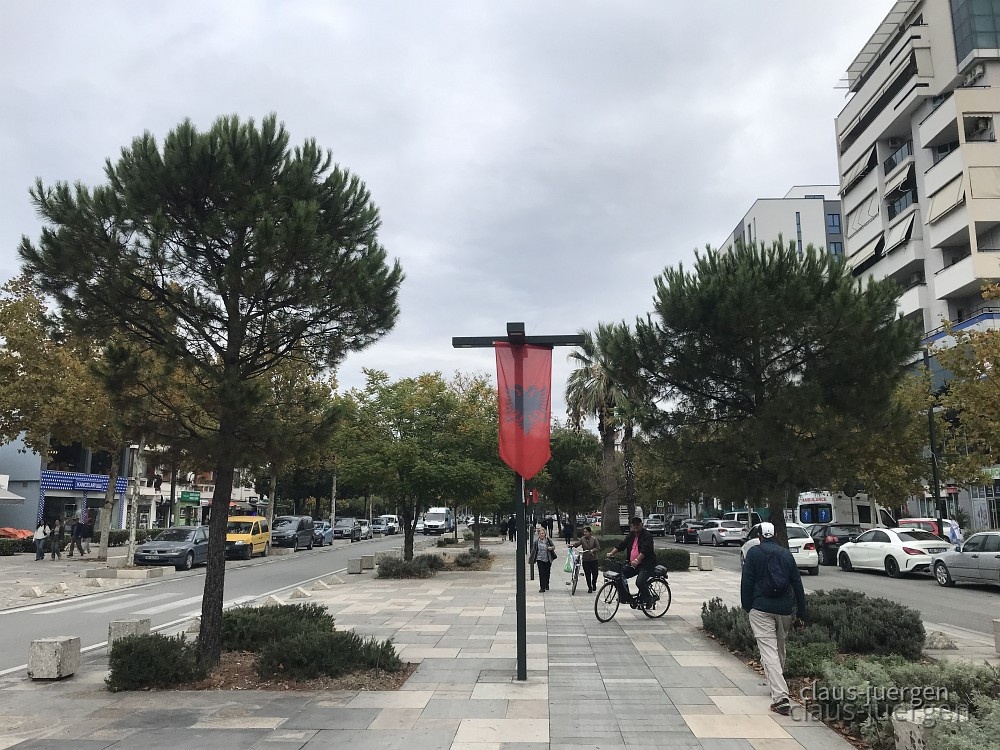 Um die Stadt zu erkunden fuhren wir etwa drei Kilometer bis ins Zentrum. Parken kann man immer in einer albanischen Großstadt. Es stellt sich nur die Frage wo. Parken in zweiter Reihe ist normal, in dritter Reihe nicht ungewöhnlich. Auch am Rand von Kreisverkehren oder Kreuzungen wird das Auto abgestellt. Irgendwie geht das alles. Die Bordsteine der Gehwege sind meist recht hoch, so daß nur SUV dort abgestellt werden können. Strafzettel sind anscheinend weitgehend unbekannt obwohl die Polizei durchaus Präsenz zeigt.