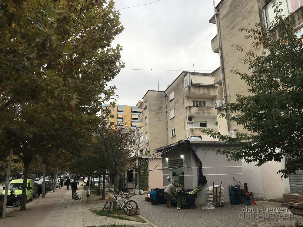 Um die Stadt zu erkunden fuhren wir etwa drei Kilometer bis ins Zentrum. Parken kann man immer in einer albanischen Großstadt. Es stellt sich nur die Frage wo. Parken in zweiter Reihe ist normal, in dritter Reihe nicht ungewöhnlich. Auch am Rand von Kreisverkehren oder Kreuzungen wird das Auto abgestellt. Irgendwie geht das alles. Die Bordsteine der Gehwege sind meist recht hoch, so daß nur SUV dort abgestellt werden können. Strafzettel sind anscheinend weitgehend unbekannt obwohl die Polizei durchaus Präsenz zeigt.