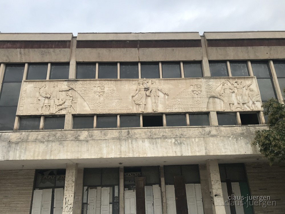 An der Fassade prangern die üblichen "glücklichen werktätigen Arbeiter mit ihren Familien".