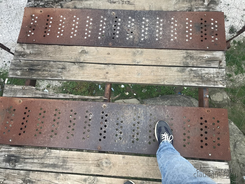 Aus der Perspektive schaut zumindest dieses Teilstück stabil aus. Blöd wird es halt, wenn es naß ist und windig. Aber man kann sich ja am Drahtseil zu beiden Seiten festhalten.