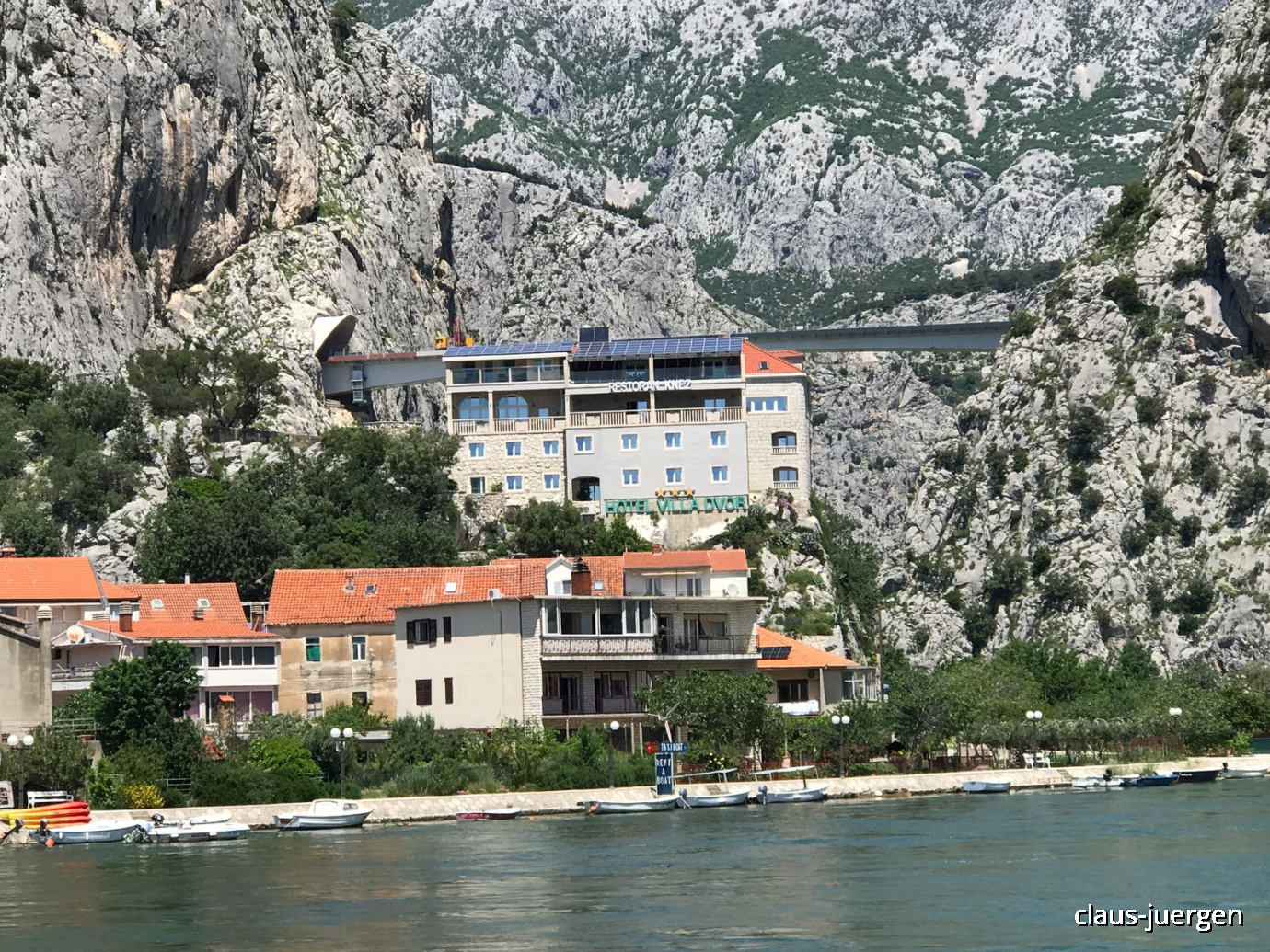 Das ist die neue Brücke über die Cetina bei Omis in Dalmatien. Auf beiden Seiten endet die Fahrbahn in einem Tunnel. Vor zwei Jahren war die Brücke noch nicht ganz fertig. Mittlerweile ist diese Straße eröffnet.