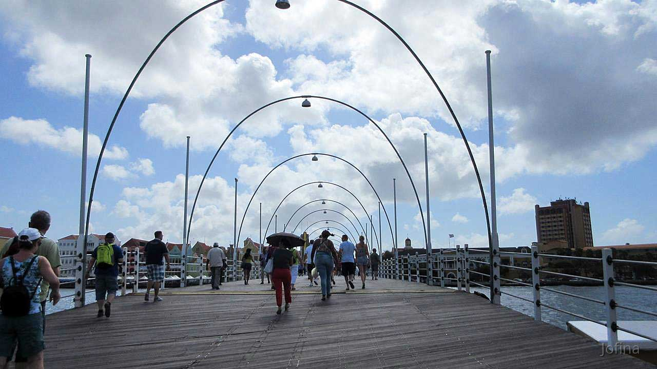 Um zu Fuß auf der Karibik-Insel Curaçao vom Ortsteil Otrabanda zum Stadtteil Punda zu gelangen, benutzt man diese interessante Brücke. Es ist die Königin-Emma-Brücke, erbaut 1886. Es ist eine Pontonbrücke, die bei Bedarf, d.h. wenn ein Schiff die Bucht verlassen oder hinein will, Richtung Ufer gedreht wird. Wenn man nicht rechtzeitig die Brücke überquert, dann muss man dort stehen bleiben und warten bis das Schiff hindurchfährt.