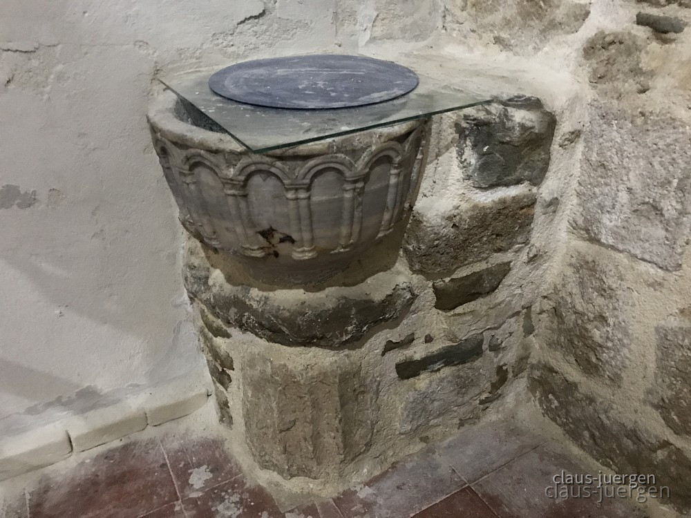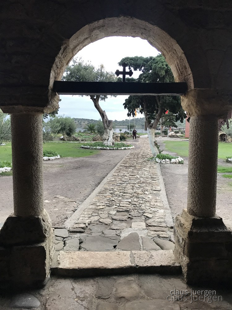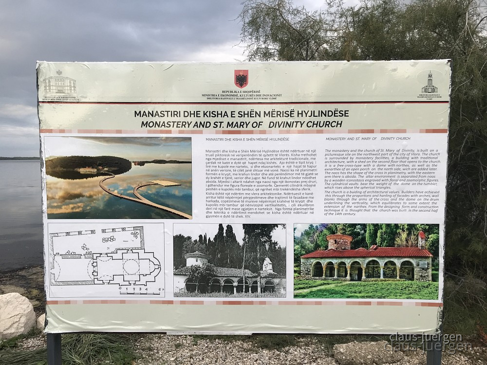 Als wir auf dem Rückweg von Berat in Vlora ankamen war es zwar spät nachmittags. Allerdings genügte uns die Zeit vor der Dämmerung noch um das Marienkloster Manastiri i Shen Merise Zvernec zu besuchen. Dabei handelt es sich um eine Klosteranlage auf einer Insel in der Lagune nördlich von Vlora. Diese Lagune ist mit dem Meer verbunden. Ein Teil des Gewässers wird für eine Saline auch heute noch genutzt. Im Norden dieser Lagune ist das Land eben weshalb dort seit Jahren ein neuer internationaler Flughafen im Bau ist. Wenn alles klappt kann der im Jahr 2026 eröffnet werden.