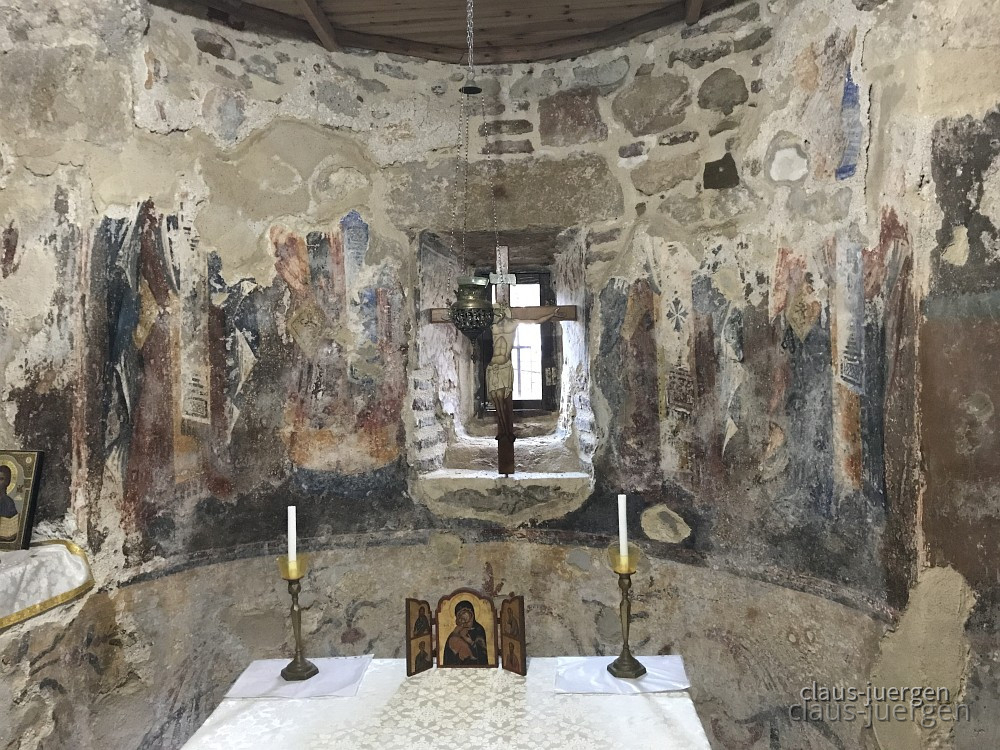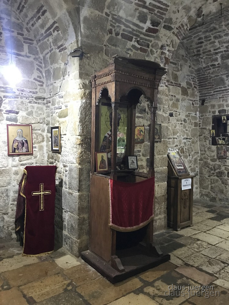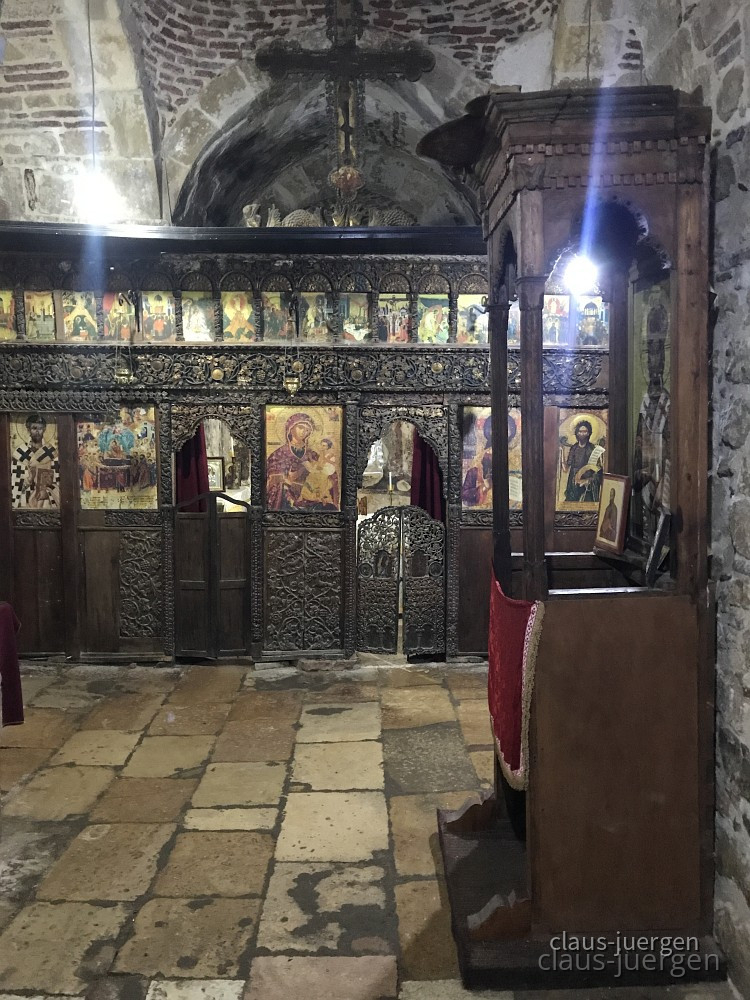 Hier sitzen oder stehen die Möche bei der Messe. Bekanntlich gibts in orthodoxen Kirchen kaum Sitzgelegenheiten weil die Messe, die übrigens mehrere Stunden dauern kann, im Stehen zelebriert wird.