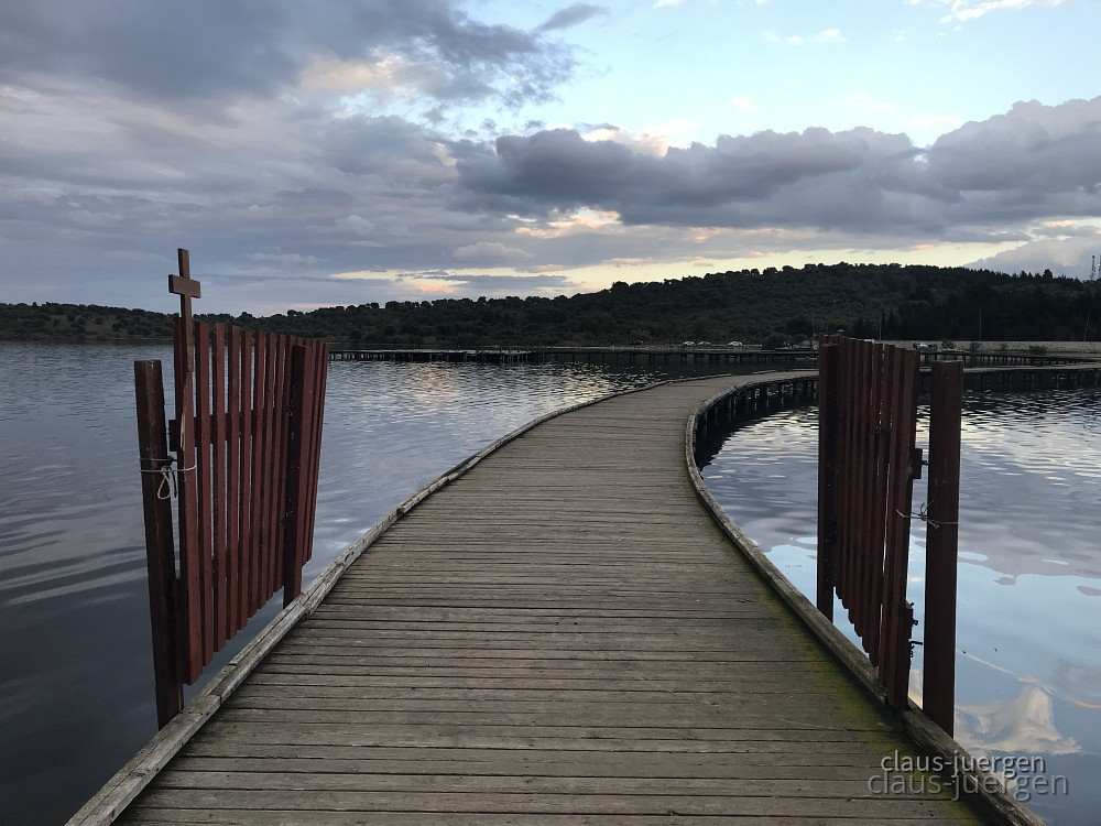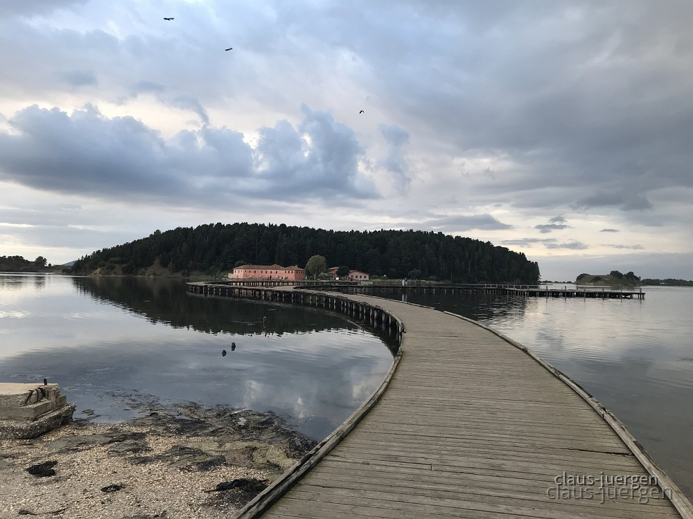 Als wir auf dem Rückweg von Berat in Vlora ankamen war es zwar spät nachmittags. Allerdings genügte uns die Zeit vor der Dämmerung noch um das Marienkloster Manastiri i Shen Merise Zvernec zu besuchen. Dabei handelt es sich um eine Klosteranlage auf einer Insel in der Lagune nördlich von Vlora. Diese Lagune ist mit dem Meer verbunden. Ein Teil des Gewässers wird für eine Saline auch heute noch genutzt. Im Norden dieser Lagune ist das Land eben weshalb dort seit Jahren ein neuer internationaler Flughafen im Bau ist. Wenn alles klappt kann der im Jahr 2026 eröffnet werden.