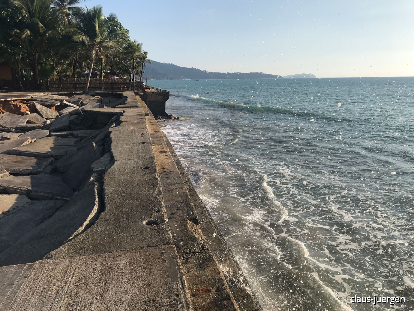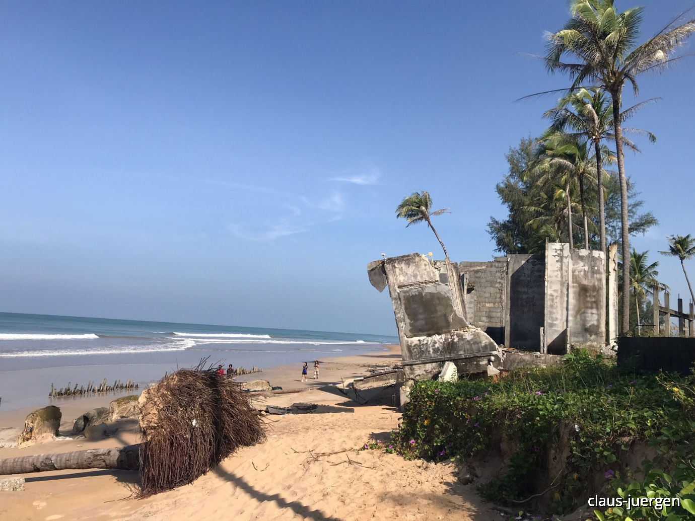 Die Ruinen bleiben jetzt wohl bis zum Sankt-Nimmerleins-Tag hier so stehen. Das Meer wird dafür sorgen, dass die Palmen früher und die Betonteile später zerkleinert werden.