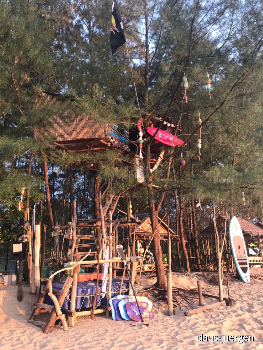 Hier hat sich ein junger Thailänder zwei Baumhäuser gebaut in welchen ihr derzeit lebt. Ich habe mich mit dem jungen Mann unterhalten und gefragt, von was er denn überhaupt lebt. Er erklärte mir, dass er überhaupt nicht viel zum Leben benötige. Ab und zu ist er als Schlagzeuger für eine Band in einem der Musiklokale in Khao Lak tätig. Die wenigen thailändischen Baht die er dafür als Entlohnung erhält genügt ihm zum Leben. Schön, wenn man mit so einem einfachen Leben zufrieden ist. Für uns in Europa ist das wohl undenkbar.