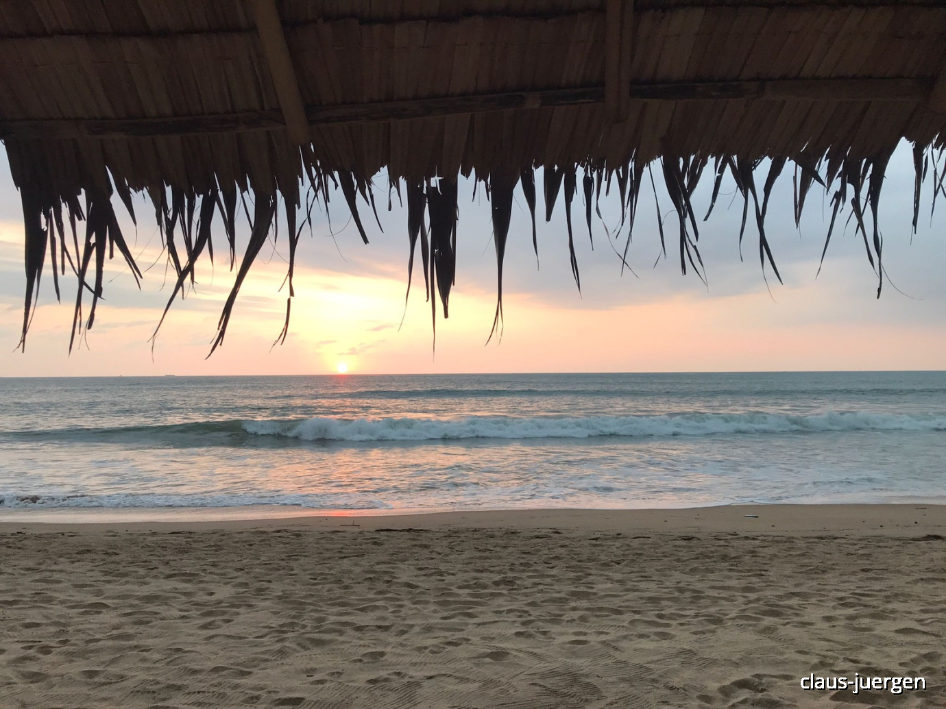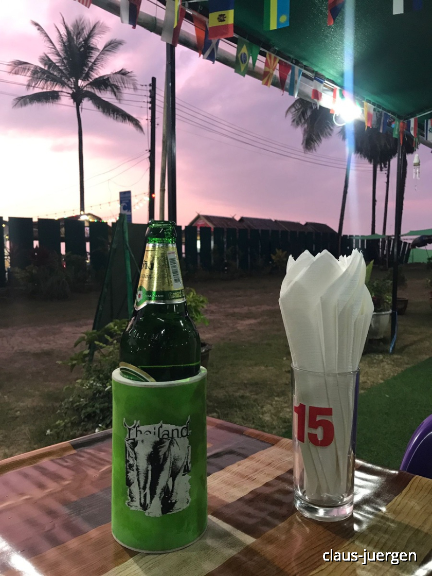 Wie genau hin sieht, erkennt meine Flasche Bier neben der Liege. Diesen Platz hat sich der junge Thailänder gebaut und mir für den Sonnenuntergang überlassen. Fast nehme ich an, dass ich an dieser Stelle um diese Tageszeit noch ab und zu weilen werde, um künftige Sonnenuntergänge zu genießen. Ich zumindest kann hier herrlich entspannen. Manche andere mag das hier zu einsam oder öde erscheinen.