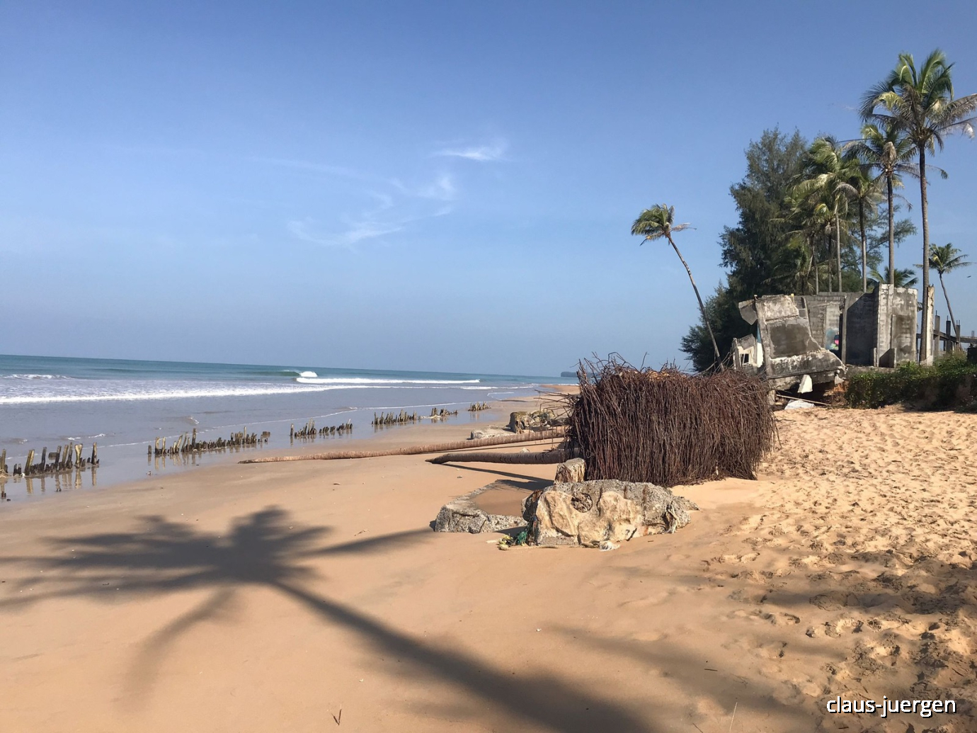 Die Ruinen bleiben jetzt wohl bis zum Sankt-Nimmerleins-Tag hier so stehen. Das Meer wird dafür sorgen, dass die Palmen früher und die Betonteile später zerkleinert werden.