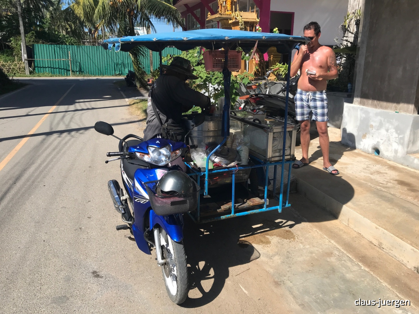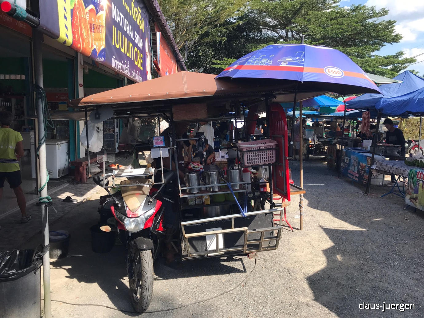 Otto gefiel es hier so gut, dass er gleich drei Eiscafe trank. Der Eiscafe in Thailand hat aber mit dem Eiscafe wie wir ihn kennen nichts zu tun. Im Becher befindet sich kein Vanilleeis mit Sahne. Vielmehr handelt es sich um einen schwarzen Kaffee der mit Eiswürfeln versetzt wird. Da kann man nun Zucker und Milch rein geben oder auch nicht. Ideal bei dieser Hitze.