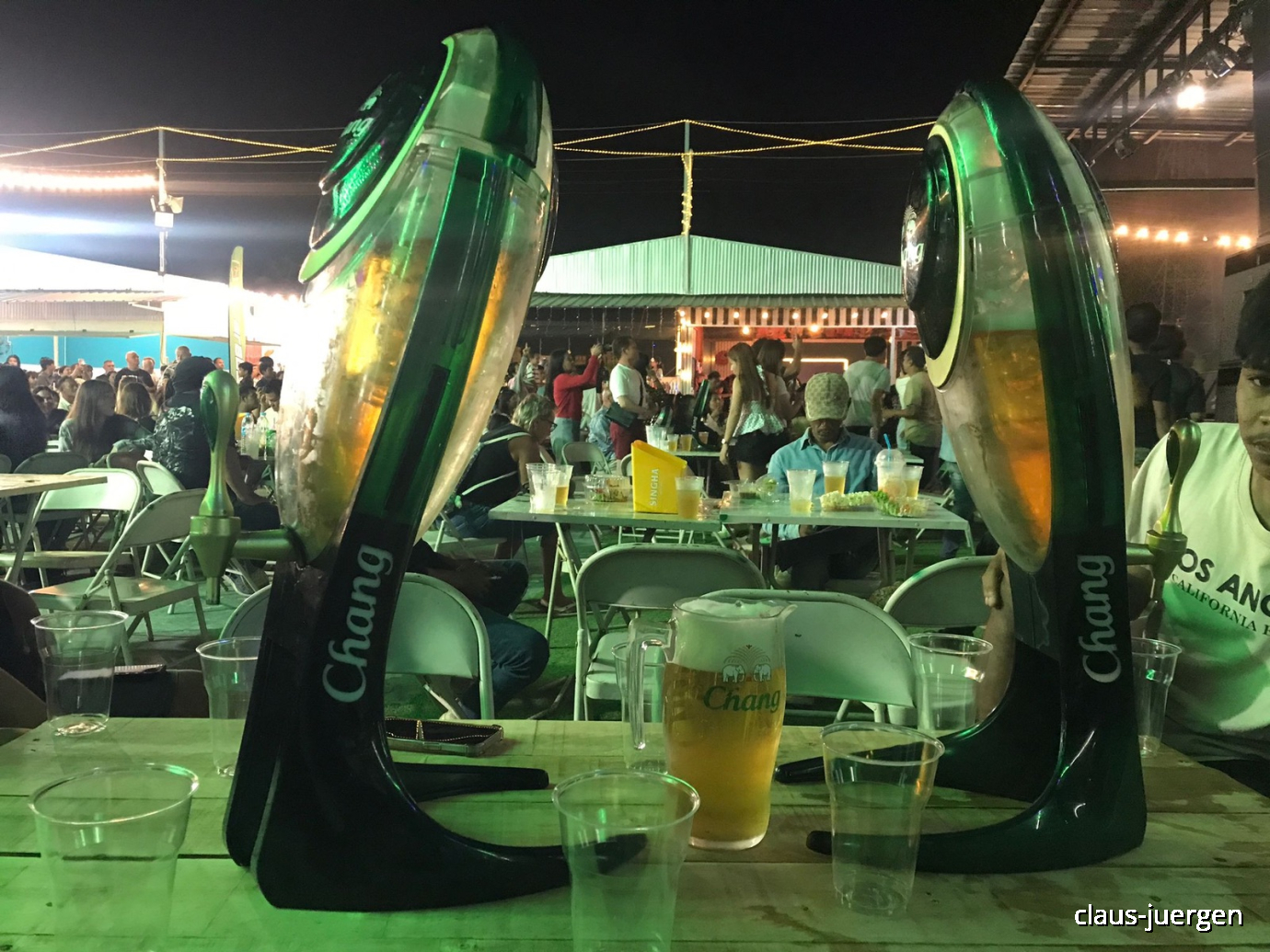 Manche Besucher lassen sich solche Zapfanlagen auf den Tisch stellen. Das Bier bleibt darin trotz 30 Grad Lufttemperatur eine Zeitlang kalt weil sich im Inneren ein Behälter mit Eis befindet. Gezapft wird in den Plastikbecher. Es gibt zwar auch Bier der Sorte Leo. Chang ist allerdings der Marktführer auf diesem Fest.