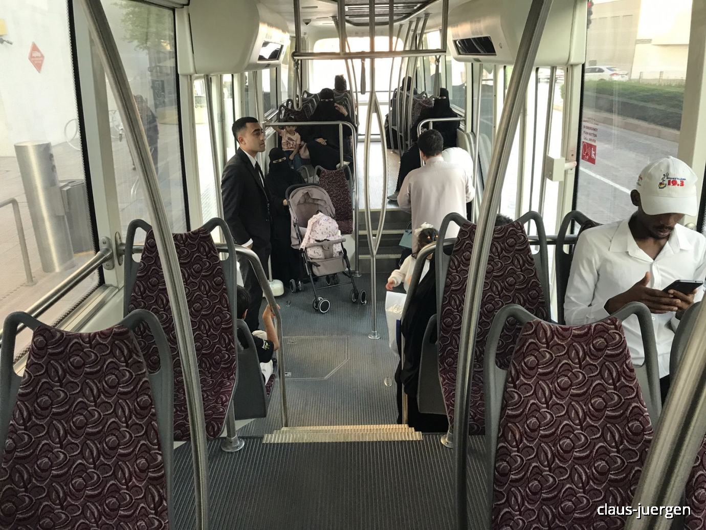 Links an der doppelflügeligen Tür steht ein Bediensteter der Transportgesellschaft, welcher den Fahrgästen bei Bedarf beim Ein- und Ausstieg behilflich ist. Natürlich ist die Trambahn ebenso wie die gesamte U-Bahn klimatisiert.