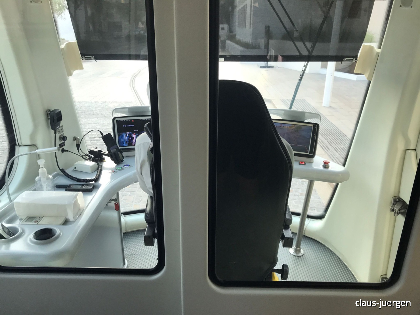 Das ist der Arbeitsplatz des Zugführers. Im Gegensatz zur fahrerlosen U-Bahn ist ein solcher bei der Trambahn noch erforderlich. Dazu kommt, dass an jeder Kreuzung oder Einmündung ebenfalls ein Bediensteter der Bahn Gesellschaft mit einer Kelle steht um Fußgänger oder Fahrzeuge anzuhalten, wenn die Trambahn kommt. Das funktioniert augenscheinlich ganz gut.