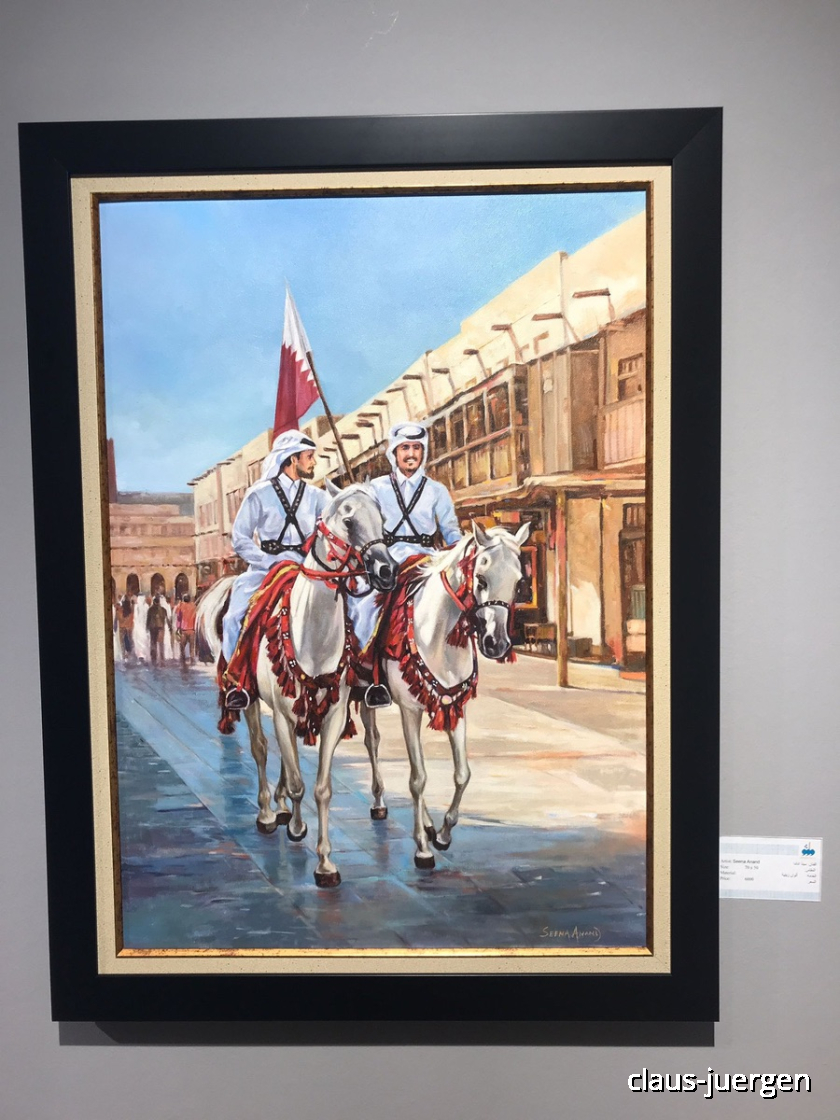 Ich zeige euch ein paar Bilder. Die Motive sind überwiegend mit dem Land verbunden und zeigen sowohl zeitgenössische Darstellungen als auch die Vergangenheit von Qatar.