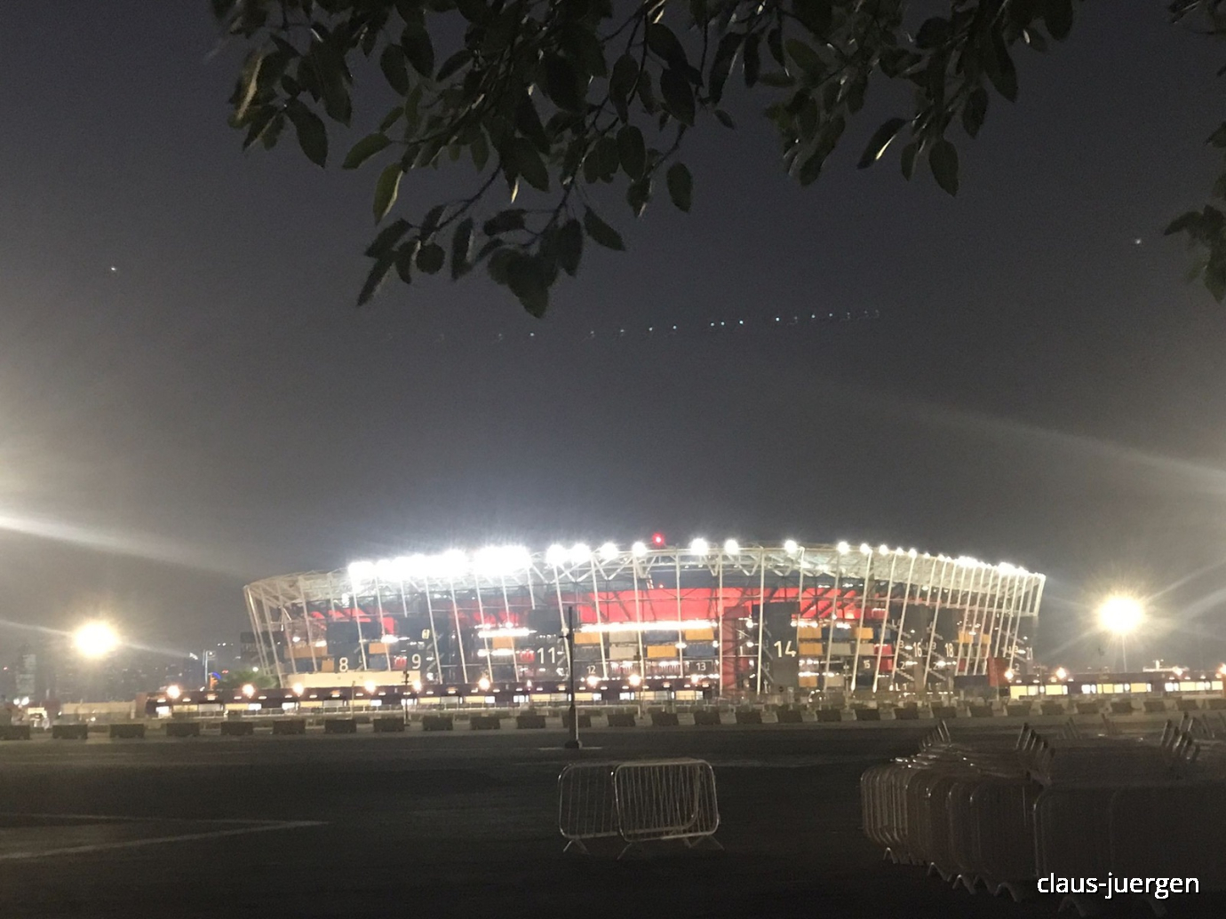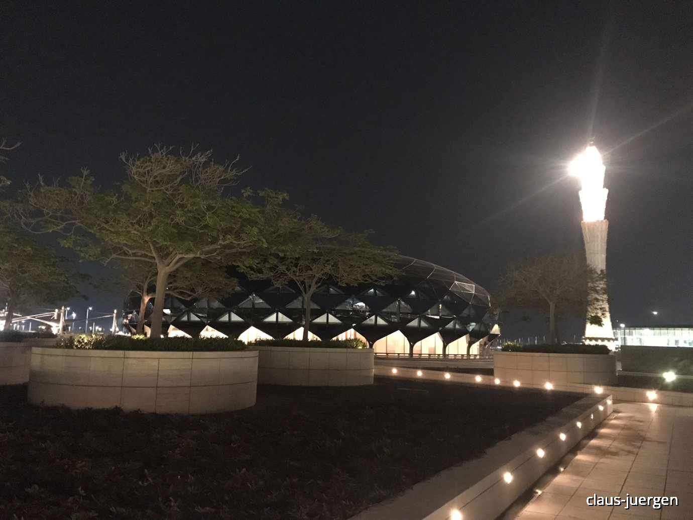 Ich bin etwa einen km über den komplett leeren Parkplatz bis zum äußeren Zaun des Stadions gegangen. Die Arena war komplett erleuchtet. Bis auf Sicherheitspersonal habe ich niemanden gesehen. Insgesamt gibt es acht Fußballstadion in Katar. Die wurden alle extra für die Fußball Weltmeisterschaft 2022 gebaut.