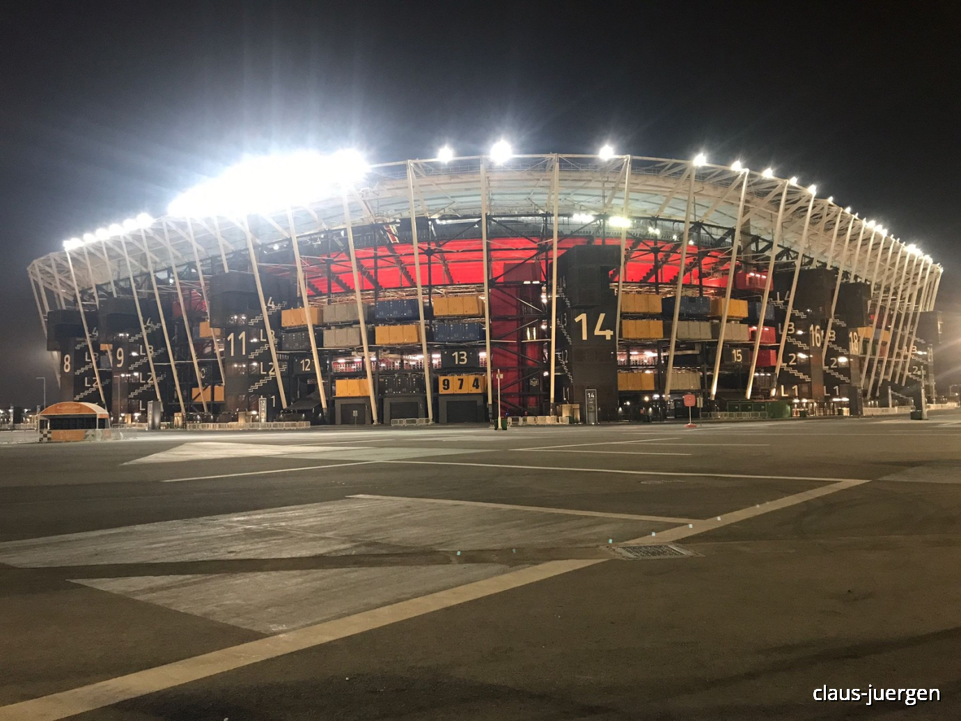 Dieses Stadion hier trägt die Nummer 974. Die Zahl ist gleichzeitig die Internationale Vorwahl für Qatar. So hat man für den Bau des Stadions 974 ausgediente Container verwendet. Eigentlich sollte das Bauwerk auch nach der WM wieder abgerissen werden. Und doch steht es noch. Seinerzeit war man stolz, dass dieses Stadion als nachhaltig im Verhältnis zu allen anderen in Katar gilt. Dies deshalb, weil beim Bau 40 % weniger Energie und Materialien verwendet wurden wie für andere Stadien mit etwa 40.000 Zuschauern Fassungsvermögen. Tatsächlich finden wohl bis heute immer wieder Fußballspiele in diesem Stadion statt.