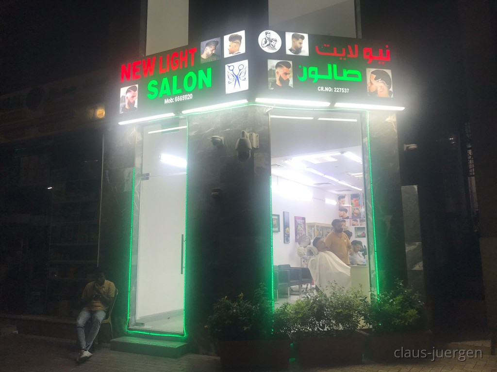 Ich bin nachmittags gegen 15:30 Uhr in München abgeflogen und kam unter Berücksichtigung der Zeitverschiebung von 2 Stunden vor 23:00 Uhr in Doha an. Auf mein Gepäck musste ich ja nicht warten weil es durchgecheckt ist. Nicht einmal eine halbe Stunde später war ich bereits im U-Bahnhof und konnte zu der Station fahren von wo aus ich in nicht einmal einer Viertelstunde zu Fuß mein Hotel erreiche. Der Friseur im Eck des Gebäudes hat da tatsächlich kurz vor Mitternacht noch geöffnet und auch Kundschaft im Laden.
