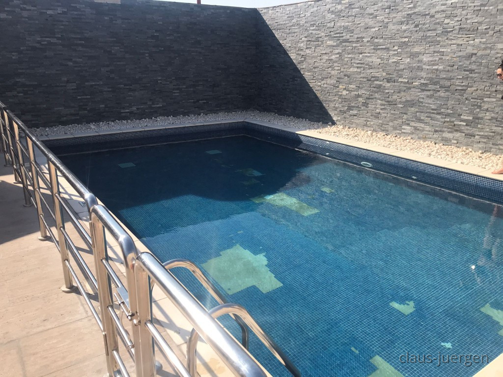 Nun macht es mir nichts aus, wenn ich am Morgen kein Frühstück bekomme. Die Tasse Nescafé im Hotelzimmer genügt mir. Wach werde ich eigentlich erst nach dem morgendlichen Schwimmen. Also ab mit dem Lift auf die Dachterrasse und den Pool in Augenschein genommen. Dort oben gibt es ein Fitnessstudio und eine kleine Terrasse mit einem überschaubaren Pool.