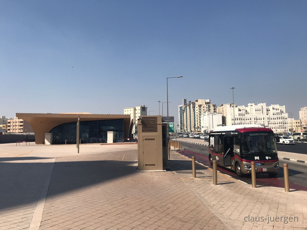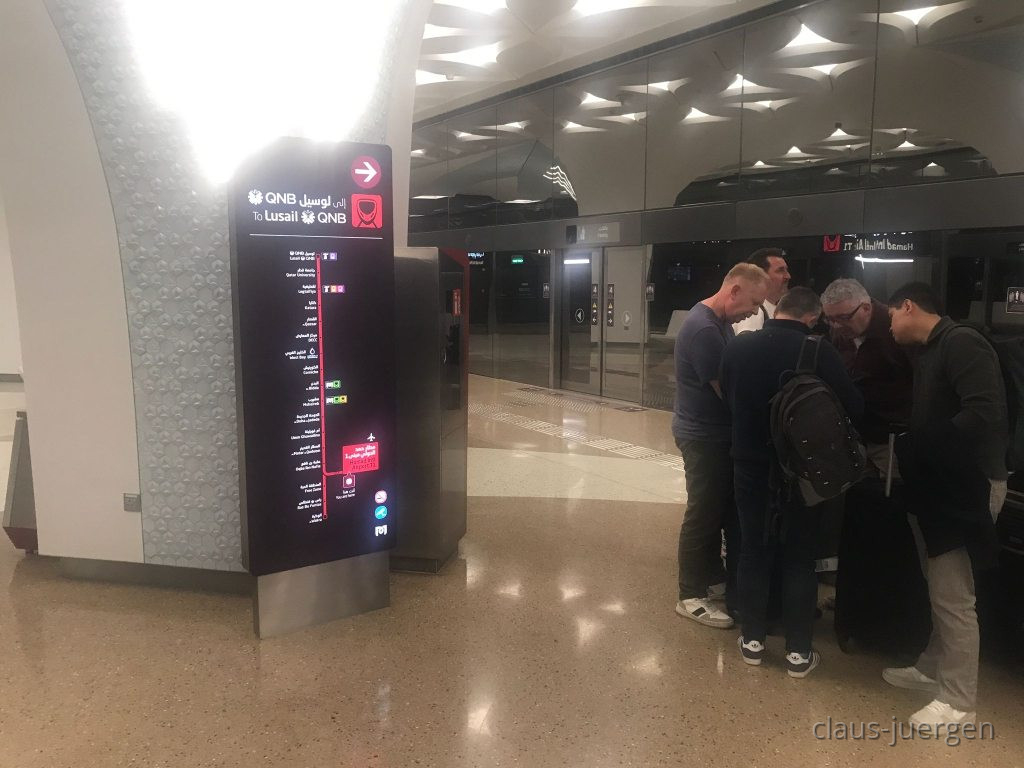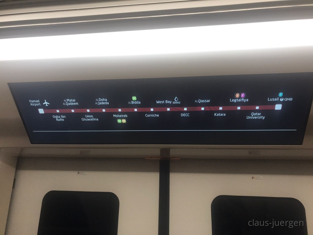 Wie auch in Dubai oder bei der MRT in Bangkok ist der Bahnsteig von den Gleisen durch Glaswände getrennt. Der fahrerlose Zug hält exakt dort, wo sich die Glaswände öffnen können und gleichzeitig die Türen des Zuges. So kann niemand aus Versehen ins Gleis fallen. Außerdem wirft da niemand seine Abfälle wie beispielsweise in München ins Gleisbett so dass sich dort die Ratten wohlfühlen. Deshalb sei nur am Rande erwähnt, dass die U-Bahn in Doha picobello sauber ist. Da liegt kein Kaugummi oder ein Zigarettenstummel auf dem Boden, geschweige denn Flaschen oder Dosen. Warum geht das bei uns nicht?
