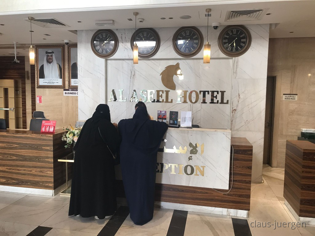Das ist der Empfang wo ich am nächsten Morgen gegen 11:30 Uhr ausgecheckt habe. Und ja, die beiden Ladies waren alleine unterwegs. Qatar scheint zwar ein konservatives Land zu sein. Und doch sieht man Frauen selbst in westlicher Kleidung und eigentlich nur vereinzelt verschleiert alleine unterwegs und in Gaststätten. Eine gewisse Weltoffenheit ist wie auch in den Vereinigten Arabischen Emiraten durchaus zu beobachten.