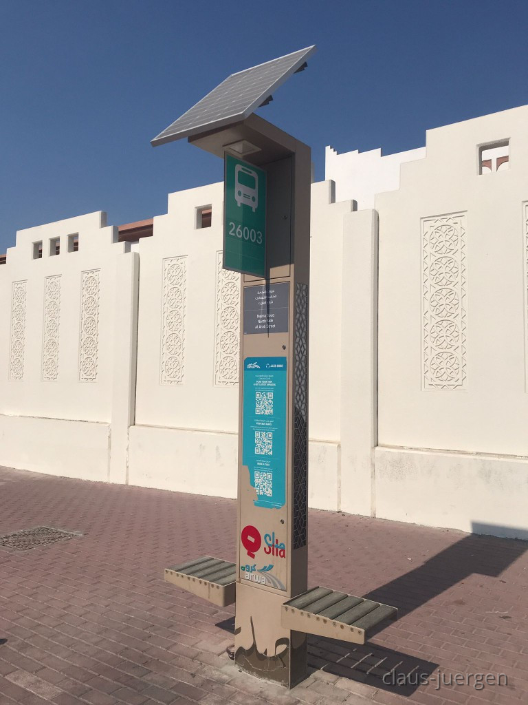 Eine Bushaltestelle gegenüber dem Hotel. Denkbar, dass man hier Busse für den Individualverkehr anfordern kann. Das nehme ich deshalb an, weil ich später elektrische Kleinbusse sah wo jeweils nur eine oder wenige Personen drin saßen. Auch gibt es Sammelplätze wo diese Busse auf was auch immer warten.