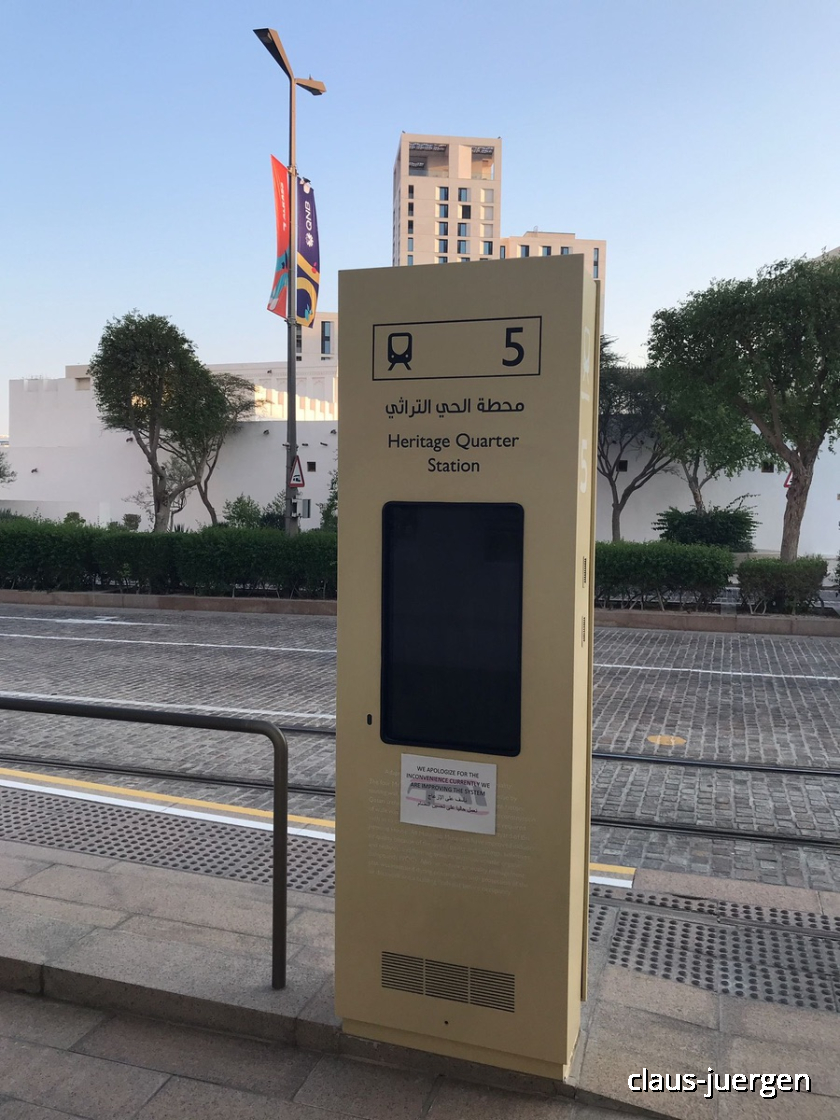 Das ist die Trambahn Haltestelle einer ringförmigen Linie direkt an den Mseireb Museen. Die Trambahn ist gratis zu befahren. Man steigt einfach einund aus wo man will. Das ließ ich mir natürlich nicht entgehen und bin etwa eine halbe Stunde lang eine Runde lang mitgefahren, bis ich wieder an dieser Haltestelle war.